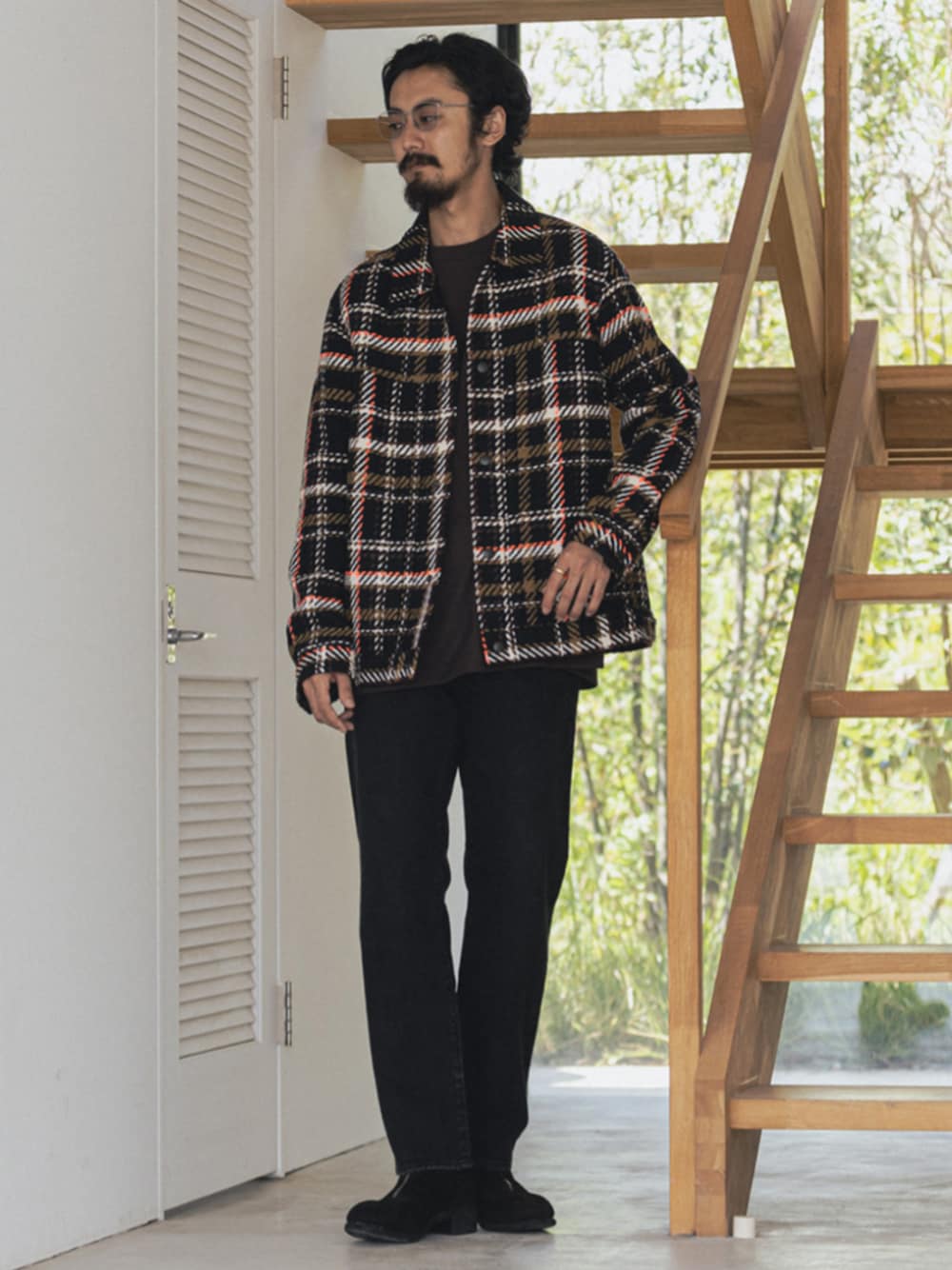 30代前半 / 身長:177cm / 体型:やせ型 / 普段サイズ:L 大人にこそ着て欲しい、ラグジュアリー見えの "ジャガード" チェック。 いつものブラックコーデにチェックを羽織るだけで、新鮮なスタイリングに。 ■DEVEAUX(デヴォー)バスケット チェック トラッカー ジャケット 着用サイズ:L ---------------------------------------------------------- サイズ感:全体的にゆとりと落ち感のあるサイズ 素材感:凹凸のある独特な素材感 着心地:生地自体に厚みを感じるものの、羽織ってみると軽くて快適です ---------------------------------------------------------- ■Levi’s(リーバイス) 30th 別注 BIG E 501(R) BLACK L28 着用サイズ:33 ---------------------------------------------------------- サイズ感:裾に向かってすっきりとしたストレートシルエット 素材感 :リアルなVINTAGE加工 着心地 :程よくジャストフィット ----------------------------------------------------------
