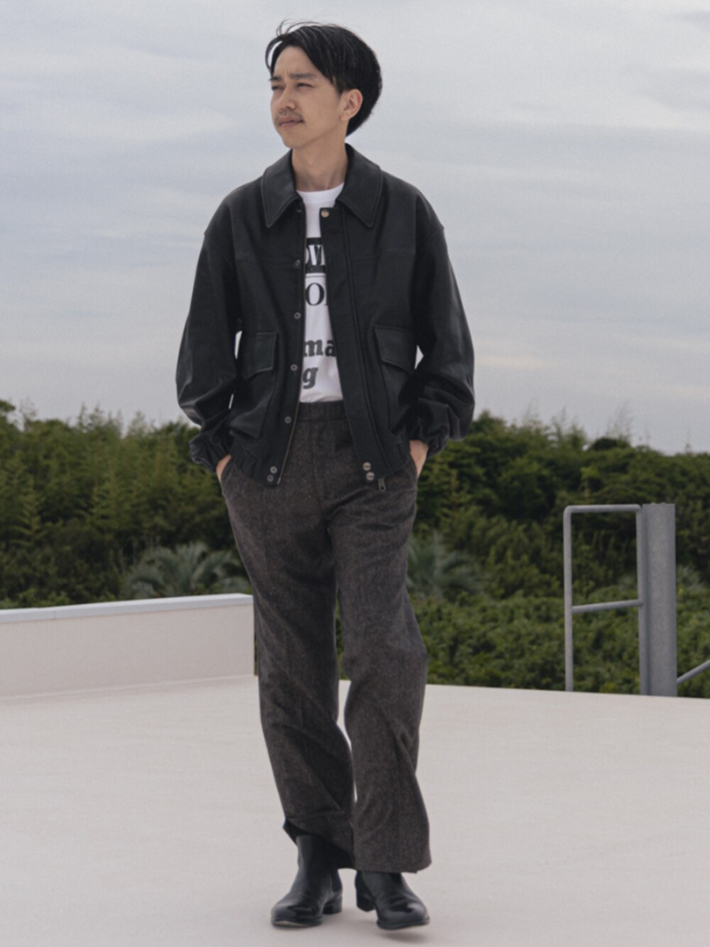 30代前半 / 身長:175センチ / 体型:痩せ型 / 普段サイズ:M 米陸軍航空隊のフライトジャケットであるA2型を重厚感のあるレザーでモダンに仕上げた一着。 コンパクトな着丈なので、きれいめなパンツとも合わせやすく、大人っぽく着用できます。 ■A2 レザーショートブルゾン 着用サイズ:L ---------------------------------------------------------- サイズ感:程よくリラックス感のあるサイズ 素材感:しなやかでしっとりとしたレザー素材 着心地:見た目以上にソフトな質感なので、動きが妨げられず着やすいです ---------------------------------------------------------- ■TEXTILE PAINT (テキスタイルペイント) クルーネック Tシャツ 着用サイズ:L ---------------------------------------------------------- サイズ感:ジャストルーズでややゆとりのあるサイズ感 素材感:コットン生地 着心地:リラックス感があるので着やすく快適です ----------------------------------------------------------