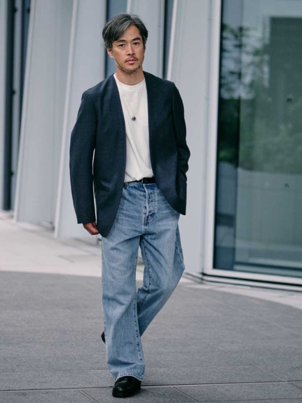 40代前半 / 身長:172cm / 体型:標準型 / 普段サイズ:M EDIFICEが提案するミニマルで洗練されたデニムコレクション。 現代的なデニムスタイルとして、V/Nシャツ、チャンキーブーツを外しで取り入れています。 あえて柄のシャツを合せる事で上品さと抜け感を出しています。ストレートデニムは厚底のブーツで裾をクッションさせた足元のボリュー ム感もポイント。 紺野 浩靖 EDFICE CONCEPTER Instagram ⇒ kon_nooo