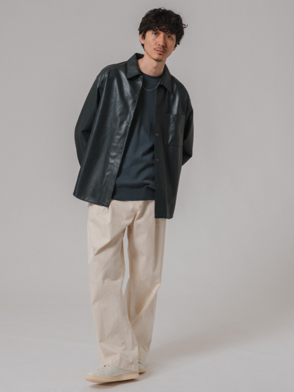 40代前半/身長:178センチ / 痩せ型 / 普段サイズ:L 都会的な抜け感を演出!大人カジュアルコーデ。 深みのあるネイビーのシャツは、カジュアルながらも上品な印象を与えてくれます。 ホワイトのワイドパンツとの組み合わせで、 都会的な抜け感を演出。 足元はスニーカーで軽快さをプラスすれば、 休日のお出かけにもぴったりです。 ■ネイキッドラムレザー シャツ 着用サイズ:L ---------------------------------------------------------- サイズ感:程よくゆとりのあるサイズ感 素材感:しなやかでしっかりとしたレザー素材 着心地:肉感のあるレザー素材ながら軽くて柔らかいので着やすいです ---------------------------------------------------------- ■14ゲージ ウール クルーネックニット 着用サイズ:L ---------------------------------------------------------- サイズ感:少しゆとりのあるジャスト目なサイズ感 素材感:滑らかな質感としなやかさのあるニット素材 着心地:ニット特有のチクチクとした感じは薄く、着やすいです ---------------------------------------------------------- ■CONFFECT SIDE ADJUST WIDE Pants 着用サイズ:L ---------------------------------------------------------- サイズ感:サイドにアジャスターがあるので、腰下の安定感が増しフィット感があります 素材感 :しっかりと立った綾目が特徴の生地 着心地 :履き込む程に味が出ます ----------------------------------------------------------