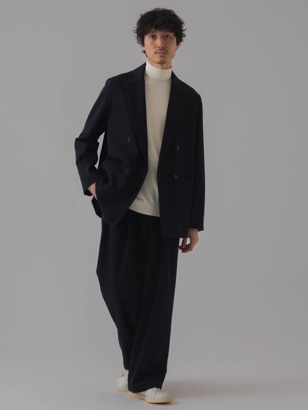 40代前半/身長:178センチ / 痩せ型 / 普段サイズ:L 深めのタックとサイドにアジャスターを配備しているワイドパンツです。 白のニットが映える深めのネイビーカラーが上品で、大人っぽさもあり、イチオシカラー。 ■CONFFECT VIST GABA W Jacket 着用サイズ:L ---------------------------------------------------------- サイズ感:ゆったりと着れます 素材感 :適度なハリを感じさせてくれます 着心地 :ブルゾンの様な着用感 ---------------------------------------------------------- ■14ゲージ ウール タートルネックニット 着用サイズ:L ---------------------------------------------------------- サイズ感:少しゆとりのあるジャスト目なサイズ感 素材感:滑らかな質感としなやかさのあるニット素材 着心地:ニット特有のチクチクとした感じは薄く、着やすいです ---------------------------------------------------------- ■CONFFECT VIST GABA SIDE ADJUST WIDE Pants 着用サイズ:L ---------------------------------------------------------- サイズ感:アジャスターがあるので、腰下の安定感がある 素材感 :毛100% 着心地 :適度なハリを感じます ----------------------------------------------------------