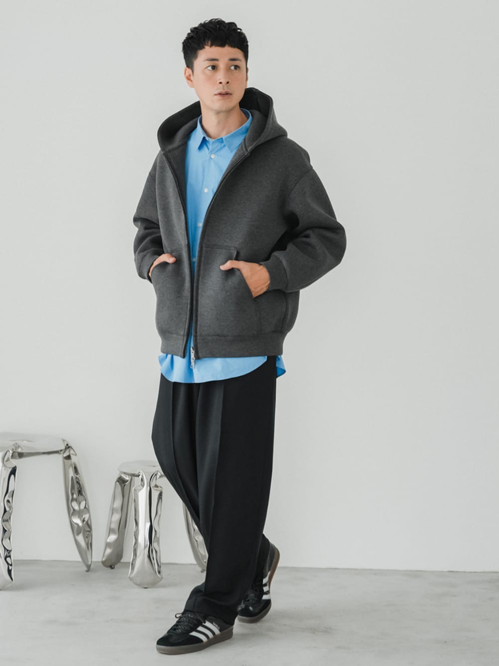 30代後半/身長:176センチ / 標準型 / 普段サイズ:L 生地のハリ感を活かした丸みのあるシルエットが特徴のジップアップパーカー。 カジュアルな印象のパーカーですが、ハリがあるので、シルエットがくずれにくく、シャツなどキレイめとも合わせやすいです。 ■ダブルニット ジップアップパーカー 着用サイズ:L ---------------------------------------------------------- サイズ感:ジャストルーズなサイズ感 素材感:ハリと肉感のある、もっちりとした素材 着心地:質感が心地良く、軽くて着やすいです ---------------------------------------------------------- ■THOMAS MASON(トーマスメイソン) オーバーサイズ レギュラーカラーシャツ 着用サイズ:L ---------------------------------------------------------- サイズ感:ストレスフリーなゆったりとしたサイズ感 素材感:高級感が伝わるツヤと滑らかさを兼ね備えた素材 着心地:肌当たりの良いサラッとした質感とビッグシルエットが心地いい着心地 ---------------------------------------------------------- ■シャーク バルーンフィット イージーパンツ 着用サイズ:L ---------------------------------------------------------- サイズ感:リラックス感のあるシルエット 素材感:適度にハリのある素材感 着心地:イージーパンツ仕様で着脱しやすく、非常に履きやすいです ----------------------------------------------------------