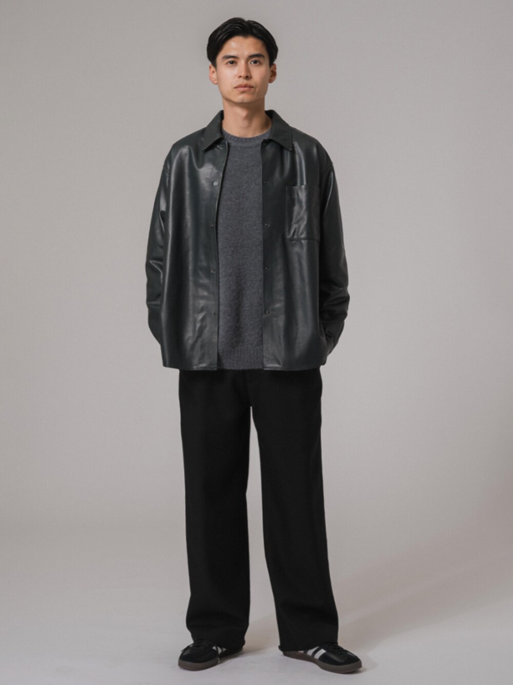 30代前半 / 身長:183cm / 体型:標準型 / 普段サイズ:L 片胸ポケット付きのラムレザーシャツ。 いつものシャツをレザーシャツにチェンジするだけで、男らしさと少しモードな印象になります。 の柔らかくしっとりとした革の風合いを残しながらも、軽い着心地が特徴です。 ■ネイキッドラムレザー シャツ 着用サイズ:L ---------------------------------------------------------- サイズ感:程よくゆとりのあるサイズ感 素材感:しなやかでしっかりとしたレザー素材 着心地:肉感のあるレザー素材ながら軽くて柔らかいので着やすいです ---------------------------------------------------------- ■WOOL NOUVEAU PANTALON 着用サイズ:L ---------------------------------------------------------- サイズ感:ウエストからヒップにかけてはジャストサイズ 素材感:程よい肉感でシワになりにくい素材 着心地:裾のボタンでパンツのボリュームを調節することができる ----------------------------------------------------------
