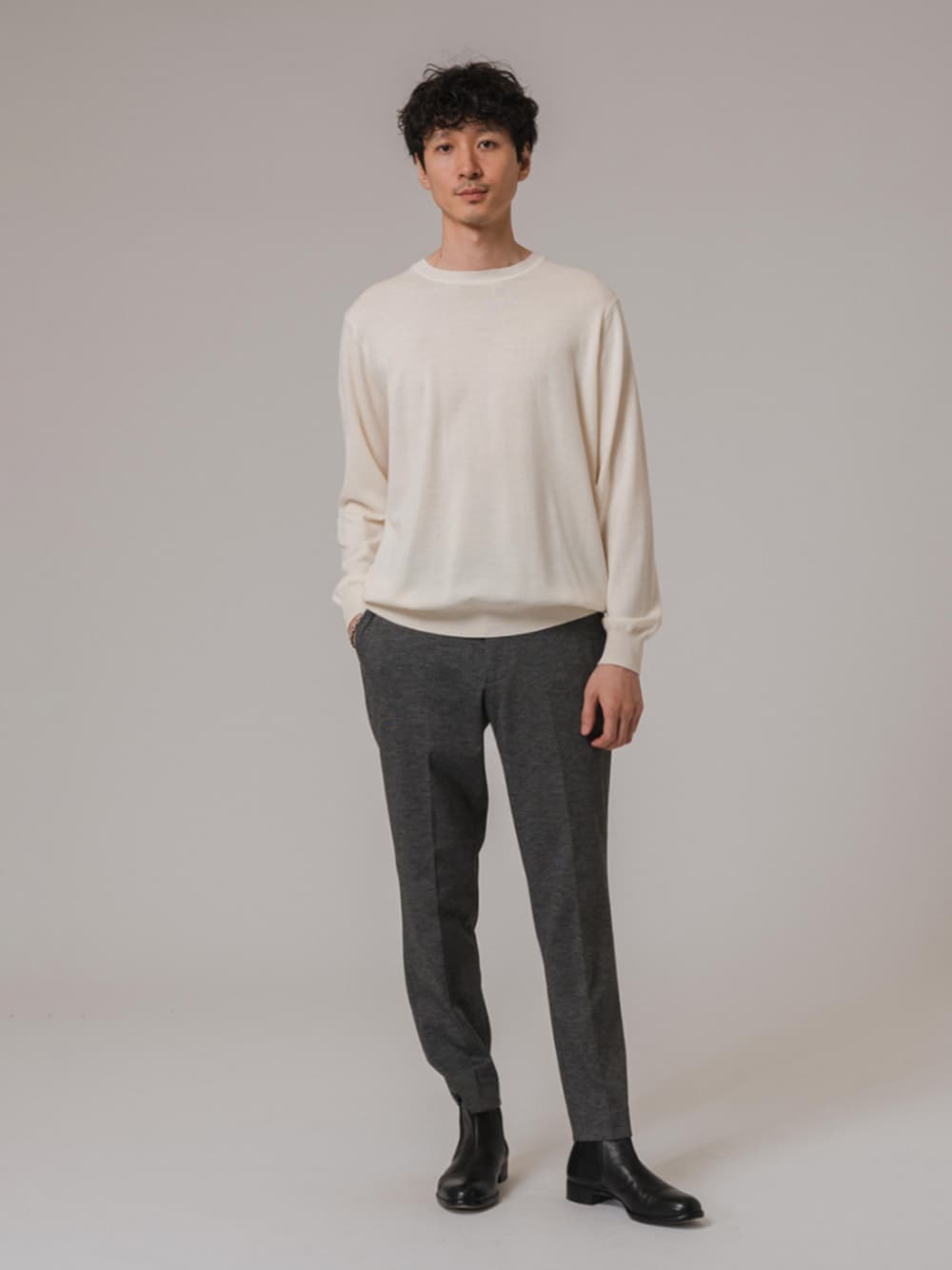 40代前半/身長:178センチ / 痩せ型 / 普段サイズ:L ビジネス~カジュアル使いまであらゆるシーンを想定したEDIFICEが誇る全方位型のスリムイージースラックス。 スリムシルエットでも、ウエストは後ろ部分がゴムのシャーリングなので着心地も◎ ホームケアが可能なところも嬉しいポイント。 ■14ゲージ ウール クルーネックニット 着用サイズ:L ---------------------------------------------------------- サイズ感:少しゆとりのあるジャスト目なサイズ感 素材感:滑らかな質感としなやかさのあるニット素材 着心地:ニット特有のチクチクとした感じは薄く、着やすいです ---------------------------------------------------------- ■ACTIVE ジャージー イージーパンツ 着用サイズ:L ---------------------------------------------------------- サイズ感:細身のスマートシルエット 素材感 :スマートシルエットながら膝が出にくい素材感 着心地 :ウエストの後ろベルト部分をゴムシャーリングさせたイージーパンツ仕様 ----------------------------------------------------------