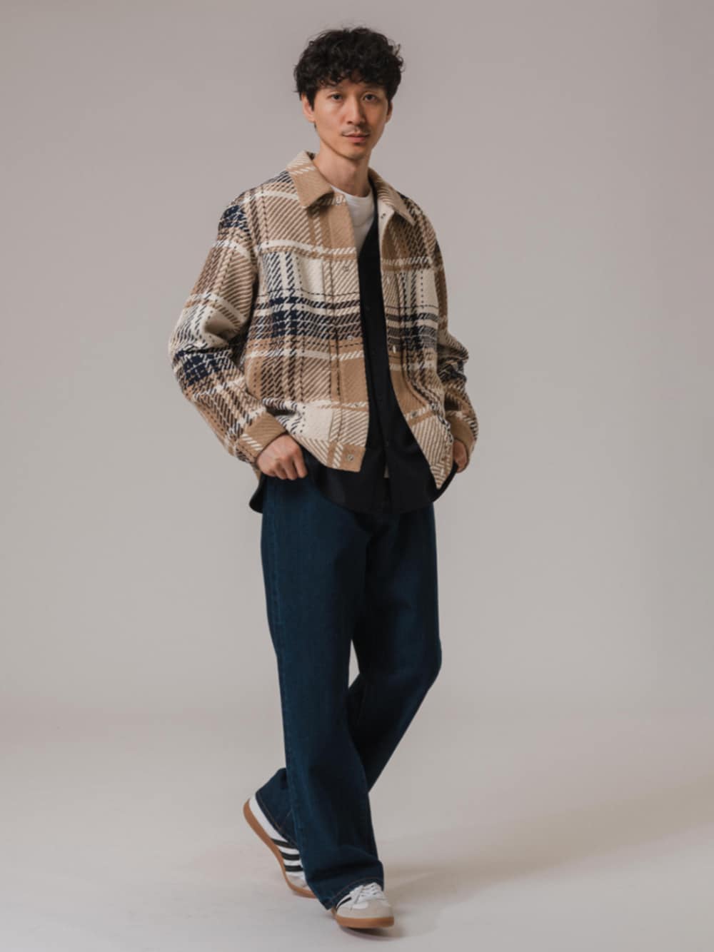 40代前半/身長:178センチ / 痩せ型 / 普段サイズ:L フランスを代表する世界的なテキスタイルメーカー、DEVEAUX / デヴォーのオリジナルファブリックを使用したドットボタン仕様のトラッカージャケット。 デニムパンツと合わせてカジュアルに着こなしました。 インナーにブラックのシャツを着用し、メリハリを付けました。 ■DEVEAUX(デヴォー)バスケット チェック トラッカー ジャケット 着用サイズ:L ---------------------------------------------------------- サイズ感:全体的にゆとりと落ち感のあるサイズ 素材感:凹凸のある独特な素材感 着心地:生地自体に厚みを感じるものの、羽織ってみると軽くて快適です ---------------------------------------------------------- ■2WAY ストレッチ ウール Vネックシャツ 着用サイズ:L ---------------------------------------------------------- サイズ感:適度にゆるさのあるサイズ感 素材感:やや起毛感のあるストレッチ素材 着心地:生地も厚すぎないので、トップス使いからインナーまで幅広く使えそうです ---------------------------------------------------------- ■EURO ストレート デニム 着用サイズ:L ---------------------------------------------------------- サイズ感:腰回りはややタイト 素材感 :綿100%の柔らかいデニム素材 着心地 :見た目以上に柔らかく上質感がある ----------------------------------------------------------