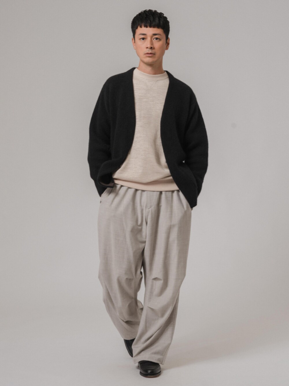 30代後半/身長:176センチ / 標準型 / 普段サイズ:L ウール混の毛並みのある素材感が特徴のゆったりとしたサイズ感のボタンレスニットカーディガン。 裏側の組織がポリエステルで編まれているため、インナーにニット特有の毛が付くストレスを減少させているのがポイント。 ■フォックスミックス シャギーニットカーディガン 着用サイズ:L ---------------------------------------------------------- サイズ感:ジャストルーズなサイズ感 素材感:毛足感のある柔らかな素材 着心地:目が詰まり過ぎていないので軽くて着やすいです ---------------------------------------------------------- ■T/W ウォッシャブル アーミーオーバーパンツ 着用サイズ:L ---------------------------------------------------------- サイズ感:たっぷりとしたワイドシルエット 素材感:ハリがあり柔らかなウール生地 着用感:ワイドシルエットでリラックスした履き心地 ----------------------------------------------------------