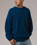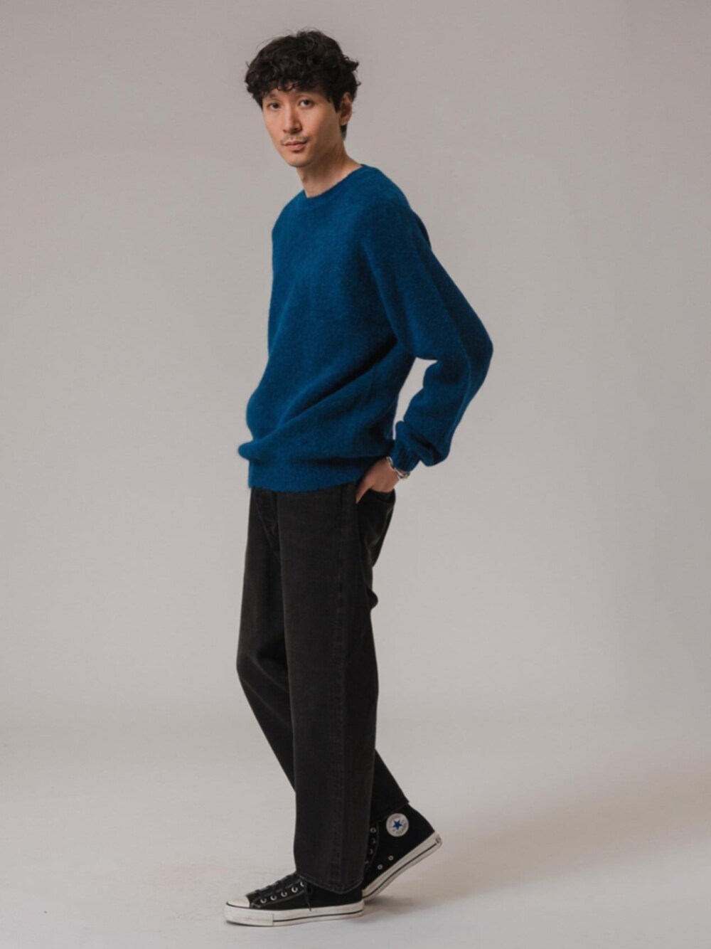 40代前半/身長:178センチ / 痩せ型 / 普段サイズ:L 全体的にストレッチ糸を入れ、編み目の詰まった、ふくらみ、もっちりとした風合いのニット。 深みのあるブルーが秋冬らしく、お顔周りも程よく華やかにしてくれます。 カラーニットが苦手な方にもおすすめのカラーです。 ■スリアルパカミックス クルーネックニット 着用サイズ:L ---------------------------------------------------------- サイズ感:クルーネックの程よくゆとり感のあるサイジング。 素材感 :滑らかで毛足が長く、モヘアのような光沢感があります。 着心地 :編み目の詰まった、ふくらみ、もっちりとした風合い。 ---------------------------------------------------------- ■Levi’s(リーバイス) 30th 別注 BIG E 501(R) BLACK L28 着用サイズ:36 ---------------------------------------------------------- サイズ感:裾に向かってすっきりとしたストレートシルエット 素材感 :リアルなVINTAGE加工 着心地 :程よくジャストフィット ----------------------------------------------------------