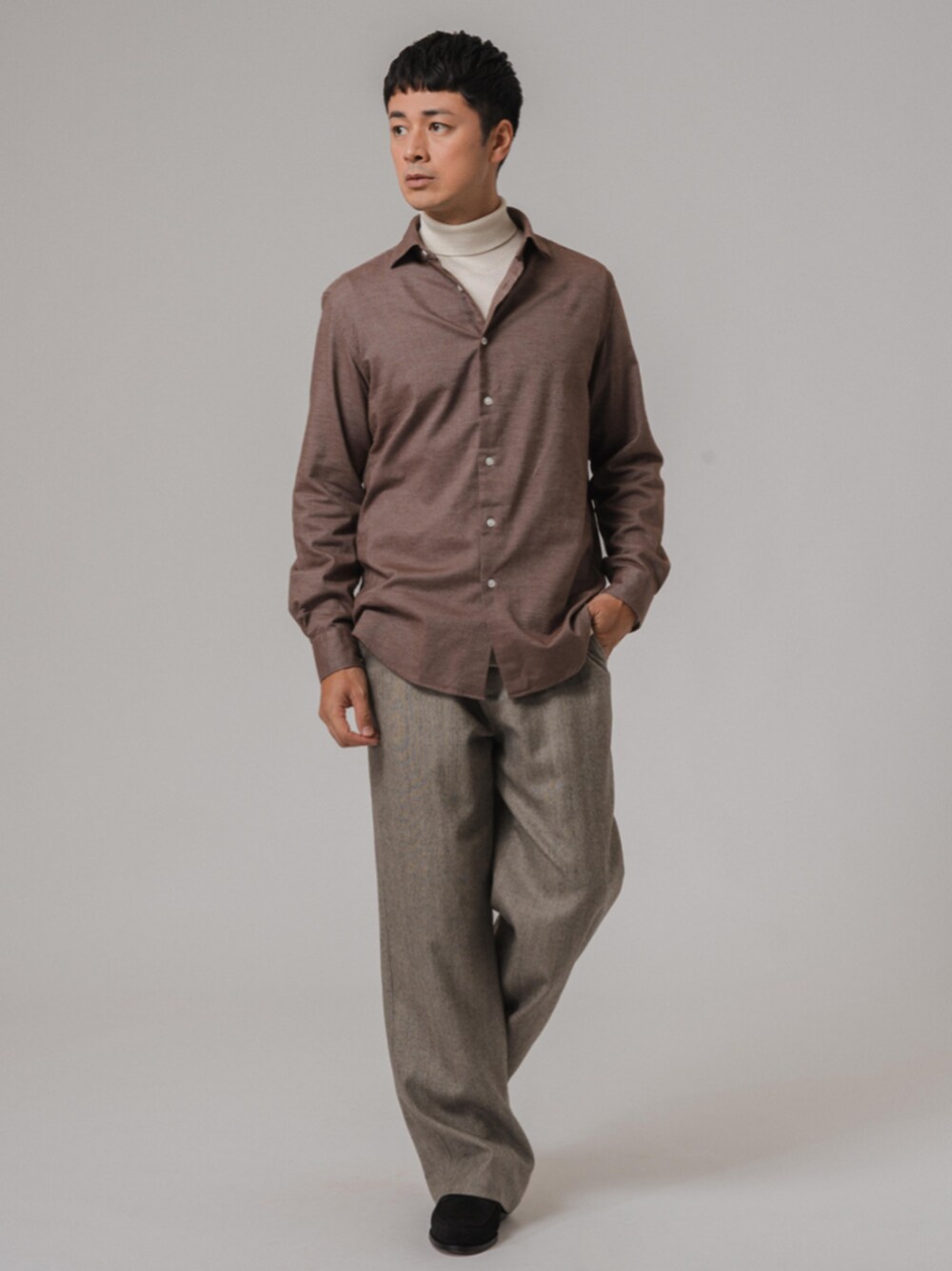 30代後半/身長:176センチ / 標準型 / 普段サイズ:L やや毛足感のあるコットン素材を使用したロングスリーブシャツ。 オフの日はタートルネックと合わせてカジュアルダウンした着こなしもおすすめ。 エレガントなイングリッシュスプレッドカラーと、あたたかみのある生地が落ち着いた大人の雰囲気を出してくれます。 ■ブラッシュドコットン イングリッシュスプレッドカラーシャツ 着用サイズ:L ---------------------------------------------------------- サイズ感:ジャストフィットでもゆとりがある 素材感 :あたたかみのある、やや毛足感のあるコットン素材 着心地 :オンオフで着用可能 ---------------------------------------------------------- ■14ゲージ ウール タートルネックニット 着用サイズ:L ---------------------------------------------------------- サイズ感:少しゆとりのあるジャスト目なサイズ感 素材感:滑らかな質感としなやかさのあるニット素材 着心地:ニット特有のチクチクとした感じは薄く、着やすいです ---------------------------------------------------------- ■WOOL NOUVEAU PANTALON 着用サイズ:L ---------------------------------------------------------- サイズ感:ウエストからヒップにかけてはジャストサイズ 素材感:程よい肉感でシワになりにくい素材 着心地:裾のボタンでパンツのボリュームを調節することができる ----------------------------------------------------------
