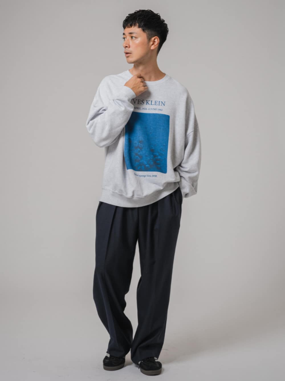 30代後半/身長:176センチ / 標準型 / 普段サイズ:L モノクロームアートで世界的に有名な画家、アーティストであるイヴ クラインのアイコニックな作品をグラフィックに落とし込んだスウェット。 無地のスウェットよりもEDIFICEらしい印象になり、アウターの中に仕込むことで、華やかさがプラスされます。 シンプルなスタイリングでもグラフィックが映えてくれるので、スウェットのバリエーションとしておすすめです。 ■Yves Klein 別注 プリント クルーネックスウェット 着用サイズ:L ---------------------------------------------------------- サイズ感:ゆったりとしたサイズ感 素材感:程良い厚みのスウェット地 着心地:ゆったりとしたシルエットなので着やすいです ---------------------------------------------------------- ■シャーク バルーンフィット イージーパンツ 着用サイズ:L ---------------------------------------------------------- サイズ感:リラックス感のあるシルエット 素材感:適度にハリのある素材感 着心地:イージーパンツ仕様で着脱しやすく、非常に履きやすいです ----------------------------------------------------------