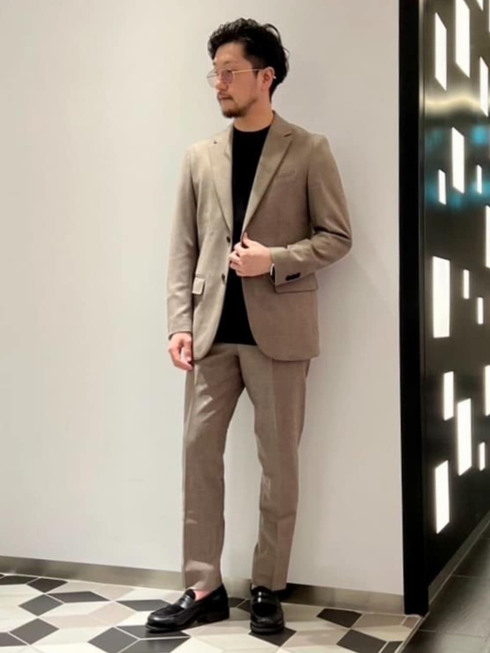 SUPER 120’s ウールサキソニー 2ボタン ジャケット SUPER 120’s ウールサキソニー テーパードパンツ 淡めの色のセットアップに、引き締める色のインナーを合わせて。 身長体重 : 170cm/61kg 普通体型 普段サイズ : M 着用サイズ : S(少しタイトめに着ています) 年齢 : 30代中盤 サイズ感 : ジャストサイズ 素材感 : 柔らかな起毛感のあるウール生地 着心地 : 軽く着やすい