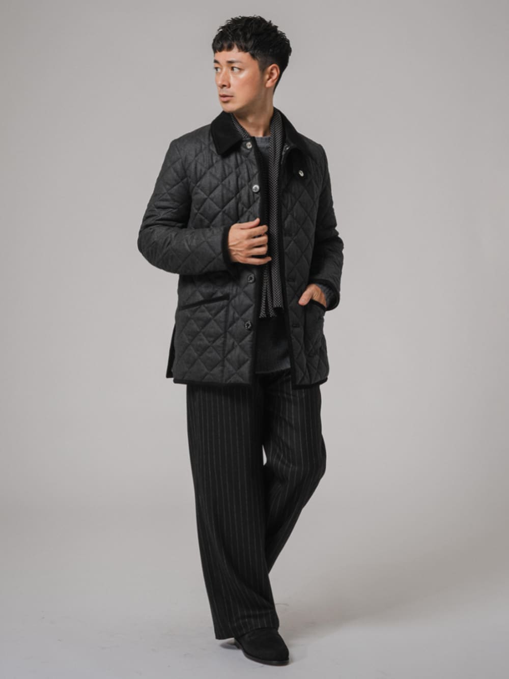 30代後半/身長:176センチ / 標準型 / 普段サイズ:L 都会的な洗練さと温かみのあるカジュアルさを兼ね備えた冬の着こなし。 シックな色使いと上品な素材感が魅力的です。 ダークグレーのキルティングジャケットが主役の、スタイリッシュな冬のコーディネート。黒のベルベットカラーがアクセントになり、高級感を演出しています。細かなストライプのパンツとの組み合わせも絶妙で、全体に統一感がありながらも、遊び心も感じられます。 ■【MACKINTOSH / マッキントッシュ】別注 WAVERLY ウール 着用サイズ:38 ---------------------------------------------------------- サイズ感:肩回りのフィット感あるサイジング 素材感:上品なウール素材 着心地:軽くしっかりとした着心地 ---------------------------------------------------------- ■スリアルパカミックス クルーネックニット 着用サイズ:L ---------------------------------------------------------- サイズ感:クルーネックの程よくゆとり感のあるサイジング。 素材感 :滑らかで毛足が長く、モヘアのような光沢感があります。 着心地 :編み目の詰まった、ふくらみ、もっちりとした風合い。 ---------------------------------------------------------- ■WOOL NOUVEAU PANTALON 着用サイズ:L ---------------------------------------------------------- サイズ感:ウエストからヒップにかけてはジャストサイズ 素材感:程よい肉感でシワになりにくい素材 着心地:裾のボタンでパンツのボリュームを調節することができる ----------------------------------------------------------