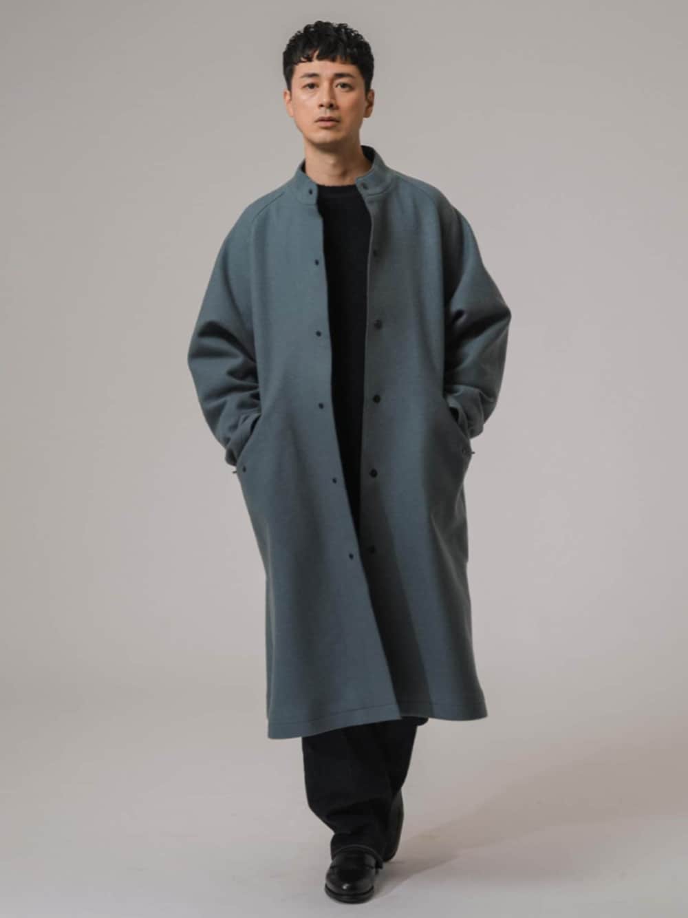 30代後半/身長:176センチ / 標準型 / 普段サイズ:L フードを外したM65パーカーをベースに、スタンドコートに見立てて仕上げたコート。 カラーはサックスブルーをチョイス。グレー寄りのブルーなので、意外と使いやすく、いつものスタイリングに羽織るだけで新鮮に見えるのでおすすめ。 オーバーサイズなので、可愛くならずにかっこよく、程よい抜け感をプラスできます。 ■CONFFECT KNIT MELTON COAT 着用サイズ:L ---------------------------------------------------------- サイズ感:ラグラン袖で、ゆったりと着れます。 素材感 :布帛ライクに仕上げたニットメルトン素材。 着心地 :おおきめなので、中にニットなど着込めます。 ---------------------------------------------------------- ■スリアルパカミックス クルーネックニット 着用サイズ:L ---------------------------------------------------------- サイズ感:クルーネックの程よくゆとり感のあるサイジング。 素材感 :滑らかで毛足が長く、モヘアのような光沢感があります。 着心地 :編み目の詰まった、ふくらみ、もっちりとした風合い。 ----------------------------------------------------------