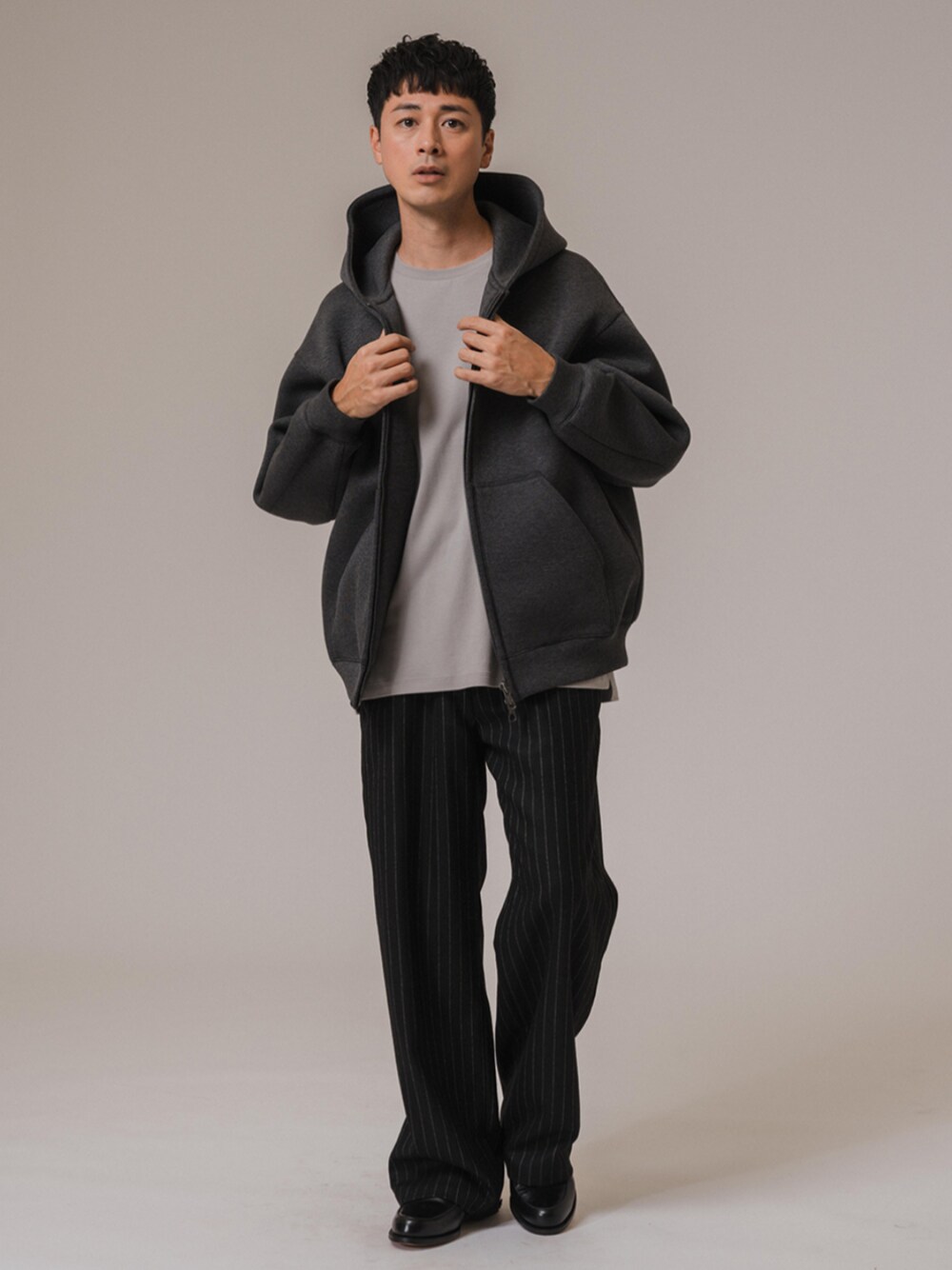30代後半/身長:176センチ / 標準型 / 普段サイズ:L パーカーはハリがあり、丸みのあるシルエットなので、カジュアル過ぎず、大人の方にもおすすめです。 スラックスと合わせるとリラックスながらも上品な印象に仕上がります。 ■ダブルニット ジップアップパーカー 着用サイズ:L ---------------------------------------------------------- サイズ感:ジャストルーズなサイズ感 素材感:ハリと肉感のある、もっちりとした素材 着心地:質感が心地良く、軽くて着やすいです ---------------------------------------------------------- ■WOOL NOUVEAU PANTALON 着用サイズ:L ---------------------------------------------------------- サイズ感:ウエストからヒップにかけてはジャストサイズ 素材感:程よい肉感でシワになりにくい素材 着心地:裾のボタンでパンツのボリュームを調節することができる ----------------------------------------------------------