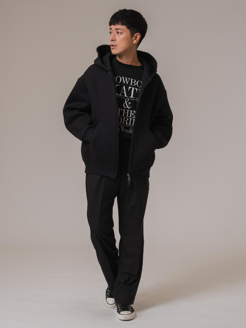 30代後半/身長:176センチ / 標準型 / 普段サイズ:L 休日などリラックスしたいときにおすすめなパーカー。 プリントTと合わせて、スラックスを合わせて程よくカジュアルに着こなしました。 ■ダブルニット ジップアップパーカー 着用サイズ:L ---------------------------------------------------------- サイズ感:ジャストルーズなサイズ感 素材感:ハリと肉感のある、もっちりとした素材 着心地:質感が心地良く、軽くて着やすいです ---------------------------------------------------------- ■COUTURE D`ADAM × Sam Haskins(クチュール ドアダム×サムハスキンス) TEE 着用サイズ:42 ---------------------------------------------------------- サイズ感:ゆったり着れるサイズ感 素材感 :コットン素材100% 着心地 :一枚でもインナーとしても着用できます ----------------------------------------------------------