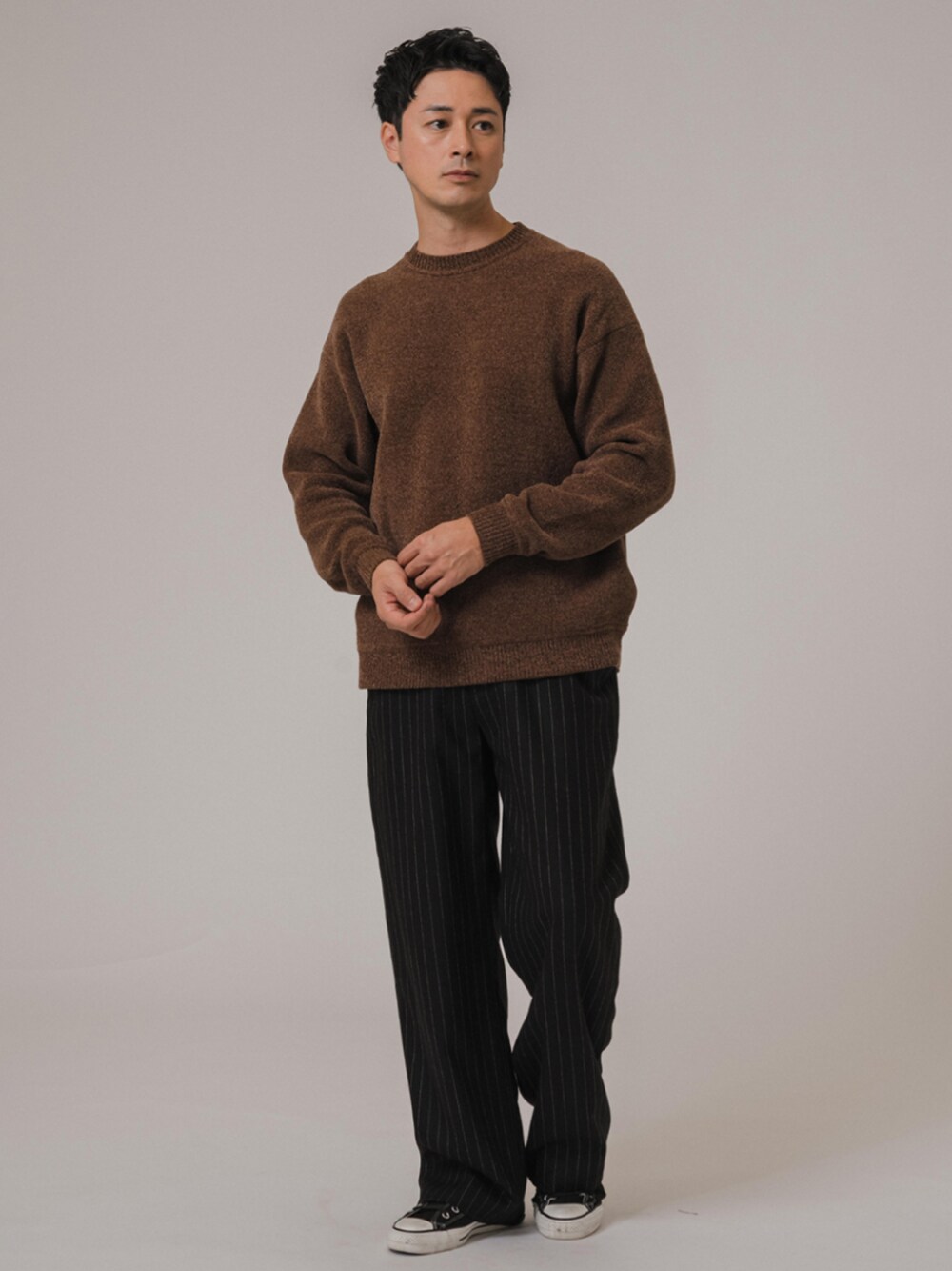 30代後半/身長:176センチ / 標準型 / 普段サイズ:L シェニールヤーンニットを主役に、上品でリラックスした雰囲気にしてみました。カジュアルながらも、素材の高級感で洗練された印象を与えています。 ■シェニール ヤーン クルーネックニット 着用サイズ:L ---------------------------------------------------------- サイズ感:適度にゆったりとしたサイズ感 素材感 :ベロアの様な上品な落ち着いた光沢と柔らかな肌触り 着心地 :もっちりとした質感で着心地も快適 ---------------------------------------------------------- ■WOOL NOUVEAU PANTALON 着用サイズ:L ---------------------------------------------------------- サイズ感:ウエストからヒップにかけてはジャストサイズ 素材感:程よい肉感でシワになりにくい素材 着心地:裾のボタンでパンツのボリュームを調節することができる ----------------------------------------------------------