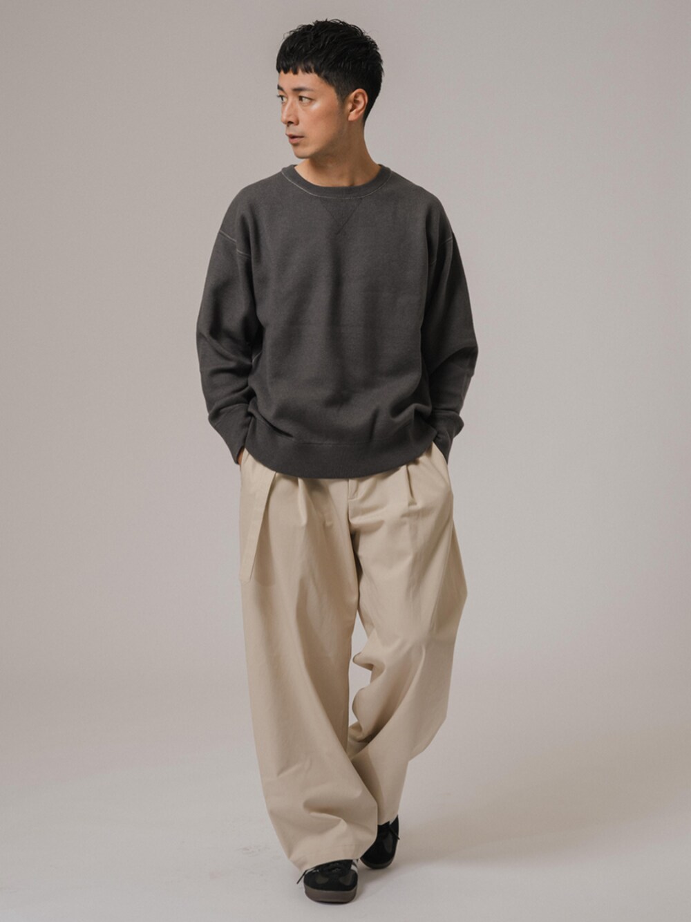 30代後半/身長:176センチ / 標準型 / 普段サイズ:L リラックスシルエットのスウェットデザインのニット。 ゆったりしてますが、オーバーサイズ過ぎないので、程よいカジュアルさがありながらも品よく着こなせます。 ■スウェットライクニット 着用サイズ:L ---------------------------------------------------------- サイズ感:リラックスシルエットでゆったりしてます 素材感 :様々な色が入ったジャガード生地 着心地 :中肉で柔らかいです ---------------------------------------------------------- ■ハイツイストコットン ベルテッドトラウザー 着用サイズ:L ---------------------------------------------------------- サイズ感:ヒップ周りは、前身に比べややすっきりとしてます 素材感 :シャリ感と膨らみのある素材 着心地 :深めのタックで履きやすいです ----------------------------------------------------------