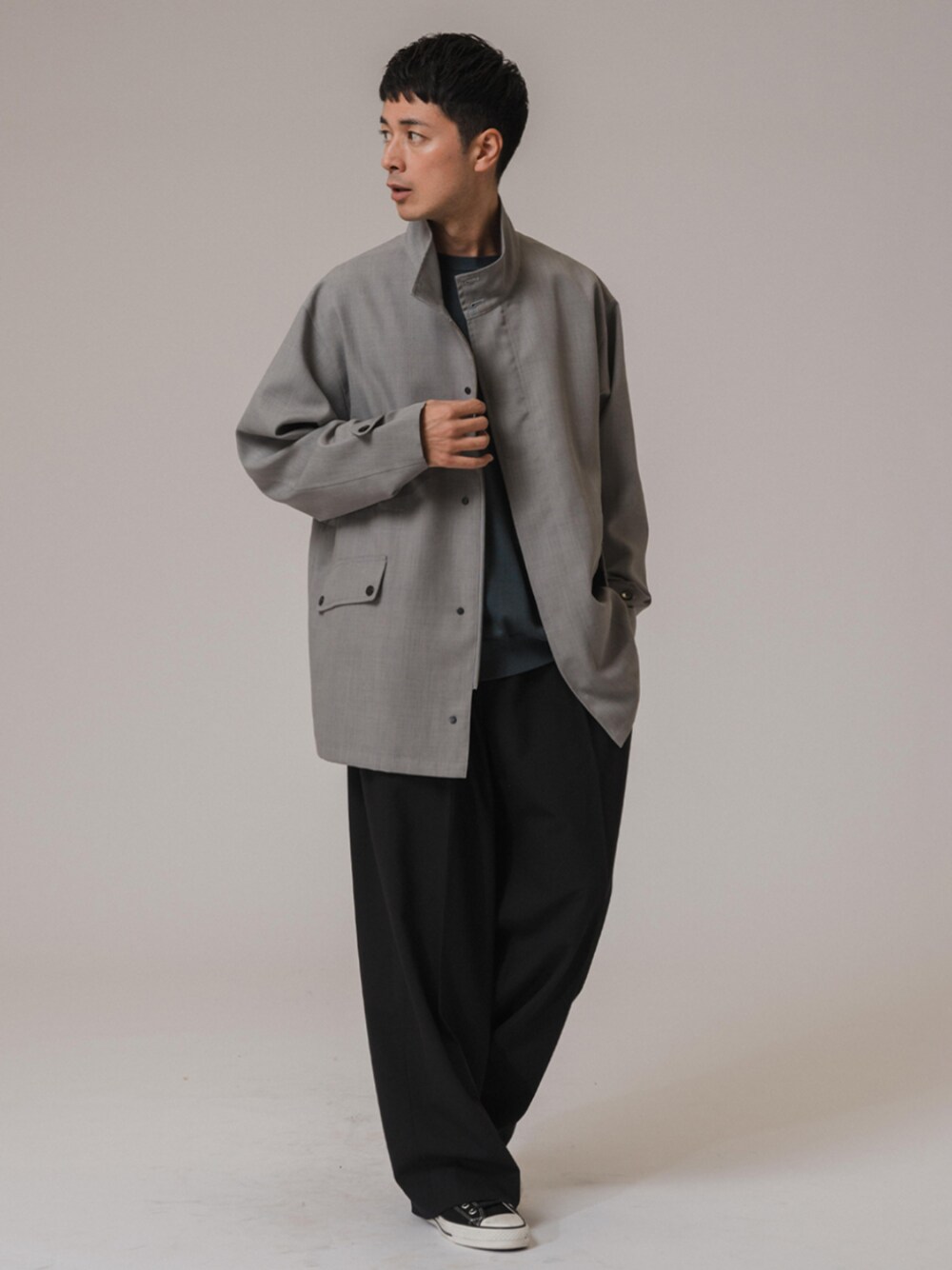 30代後半/身長:176センチ / 標準型 / 普段サイズ:L ポリエステルとウールビスコスのギャバを使用したミリタリーモチーフのブルゾン。 ゆったりとしたサイズ感ですが、スタンドカラーで洗練された印象に仕上がります。 ■【CONFFECT EDIFICE】TW GABA STAND BLOUSON 着用サイズ:L ---------------------------------------------------------- サイズ感:ゆったりとして、楽に羽織れます 素材感 :張り感のある素材 着心地 :裏地があるので、着やすいです ---------------------------------------------------------- ■14ゲージ ウール クルーネックニット 着用サイズ:L ---------------------------------------------------------- サイズ感:少しゆとりのあるジャスト目なサイズ感 素材感:滑らかな質感としなやかさのあるニット素材 着心地:ニット特有のチクチクとした感じは薄く、着やすいです ---------------------------------------------------------- ■クリアツイル ウルトラワイドパンツ 着用サイズ:L ---------------------------------------------------------- サイズ感:後ろ身ヒップまわりは程よくすっきりとしてます 素材感 :程よい生地の厚みとさらっとした風合いで、シーズンを問わず着用できます 着心地 :ウエストはイージー仕様でリラックスした履き心地 ----------------------------------------------------------