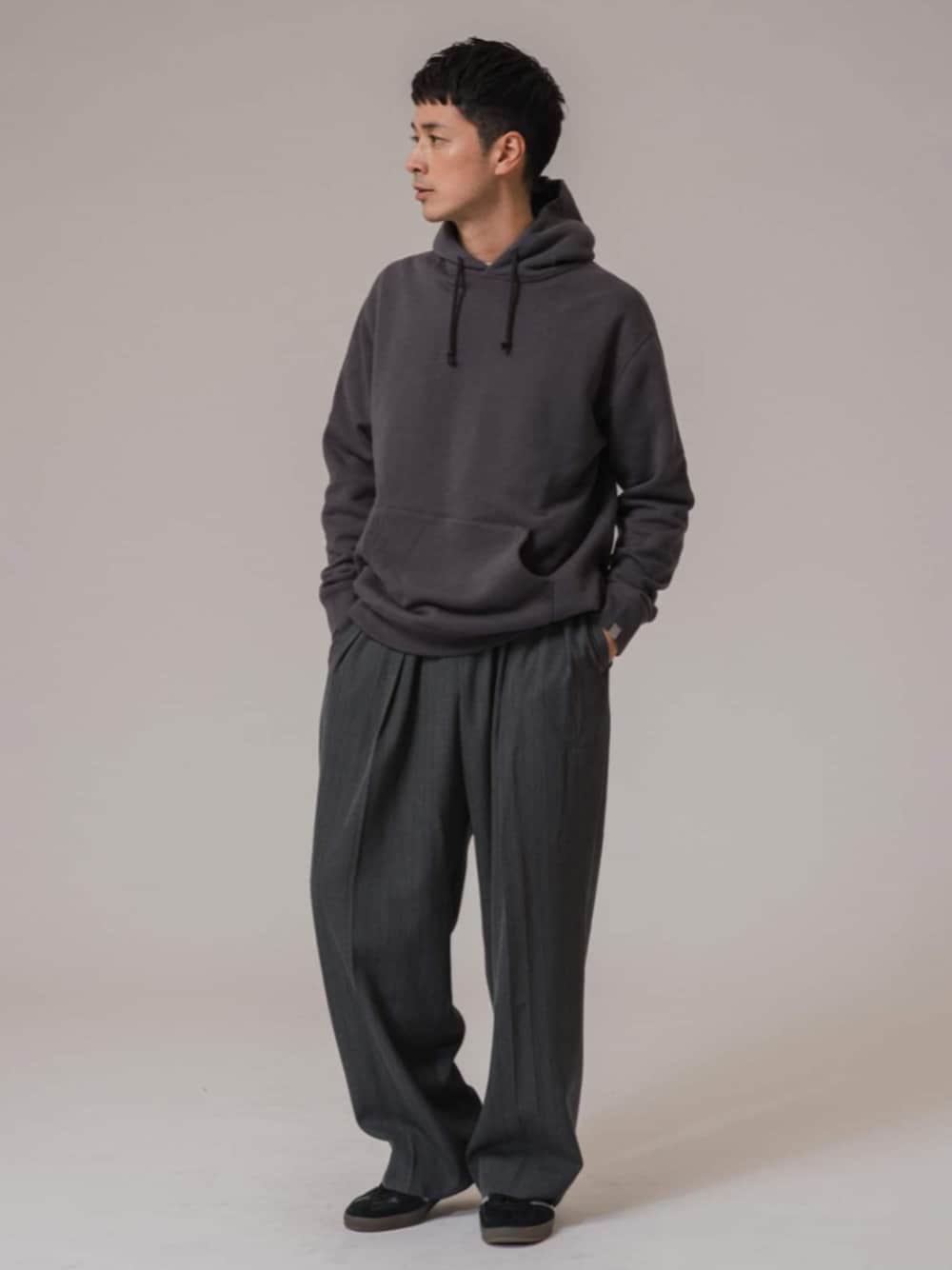 30代後半/身長:176センチ / 標準型 / 普段サイズ:L 後ろ身ヒップまわりは程よくすっきりとさせたワイドストレートパンツ。 ウエストはイージー仕様でもキレイめに履ける大人のマストハブアイテム。 パーカーと合わせて、大人カジュアルに着こなしました。 ■WEB限定 LOOPWHEELER for LOWERCASE ライトツリウラケ ルーズフィット フーディー 着用サイズ:L ---------------------------------------------------------- サイズ感: 全体的に大き目ですが、着丈はやや短くしバランスがとられています 素材感:風合いのあるソフトなコットン素材 着心地: 今らしいシルエットで快適な着心地です ---------------------------------------------------------- ■W/Vi ストライプ ウルトラワイドパンツ 着用サイズ:L ---------------------------------------------------------- サイズ感:後ろ身ヒップまわりは程よくすっきりしてます 素材感:高級感あるウールの風合いとビスコースのしなやかで程よい落ち感がある 着心地:イージー仕様で、着やすいです ----------------------------------------------------------