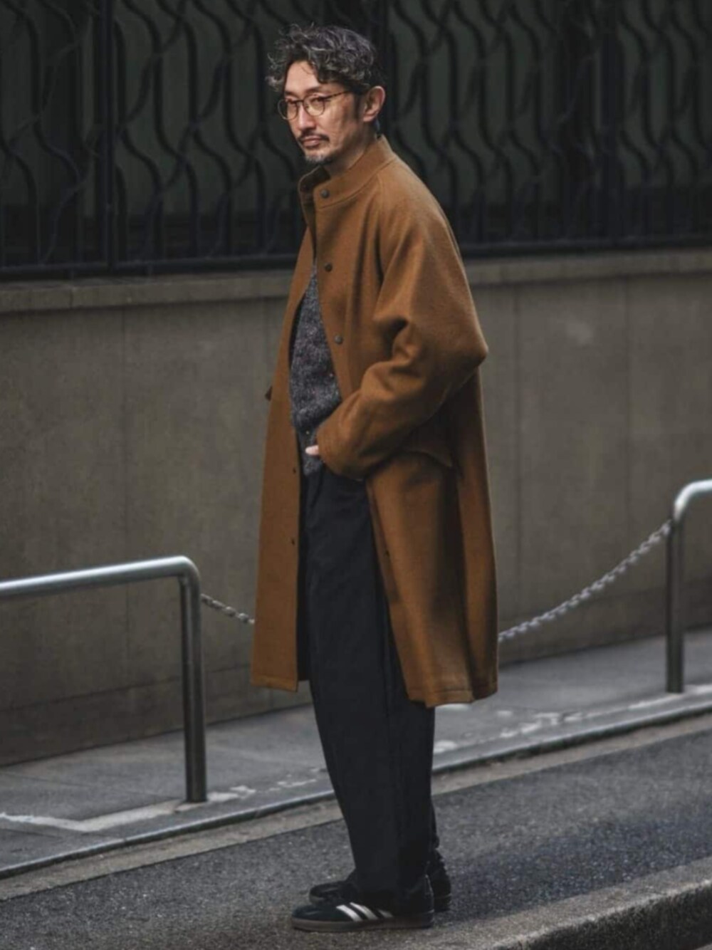 CONFFECT EDIFICE KNIT MELTON COAT フードを外したM65パーカーをベースに、スタンドコートに見立てて仕上げた一着。 サイドスリットを入れフロントのドット釦仕様など現在のタウンユースな仕上がりを目指しました。 身長:183センチ/普段サイズ:XL/着用サイズ:L 体型:がっちり体型 サイズ感:Lサイズでジャストサイズ 素材感:布帛ライクに仕上げたニットメルトン素材 着心地:全体的にゆとりがあり着やすい