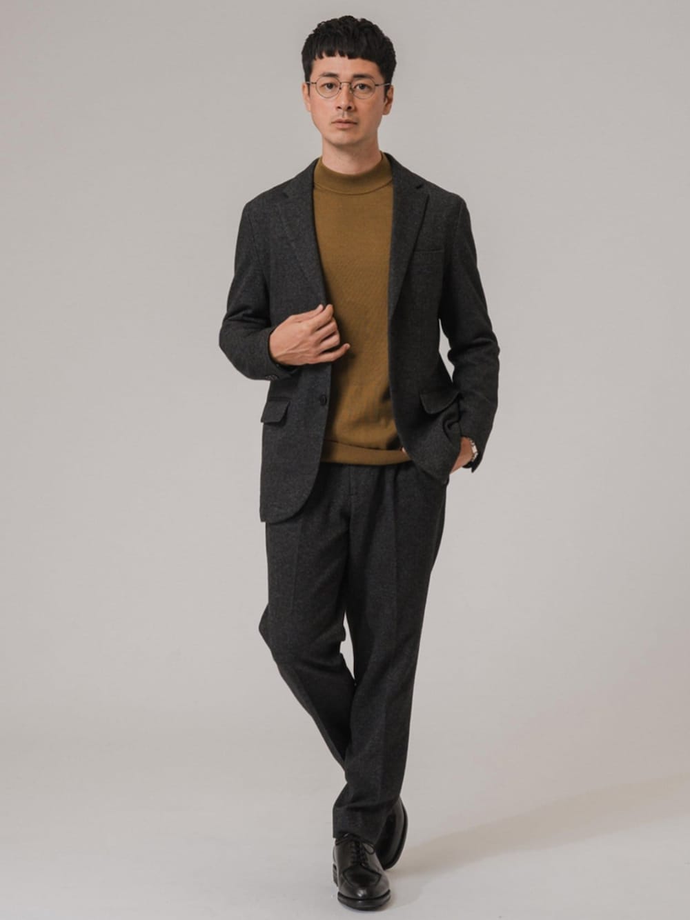 30代後半/身長:176センチ / 標準型 / 普段サイズ:L ジャケットとパンツのセットアップを中に着るアイテム次第で、幅広い着こなしが可能。 今回はマスタードカラーのニットと合わせて、季節感を意識しました。 ■コットン/ウール ジャージー 2ボタン ジャケット【セットアップ着用可】 着用サイズ:L ---------------------------------------------------------- サイズ感:袖も程よいゆとりがあり窮屈感がありません。 素材感 :ストレッチ性のある素材。 着心地 :柔らかく、動きやすくて着心地◎ ---------------------------------------------------------- ■コットン/ウール ジャージー イージースラックス【セットアップ着用可】 着用サイズ:L ---------------------------------------------------------- サイズ感:細身のテーパードシルエット。 素材感 :ストレッチ性のある素材。 着心地 :柔らかく、動きやすくて着心地◎ ----------------------------------------------------------