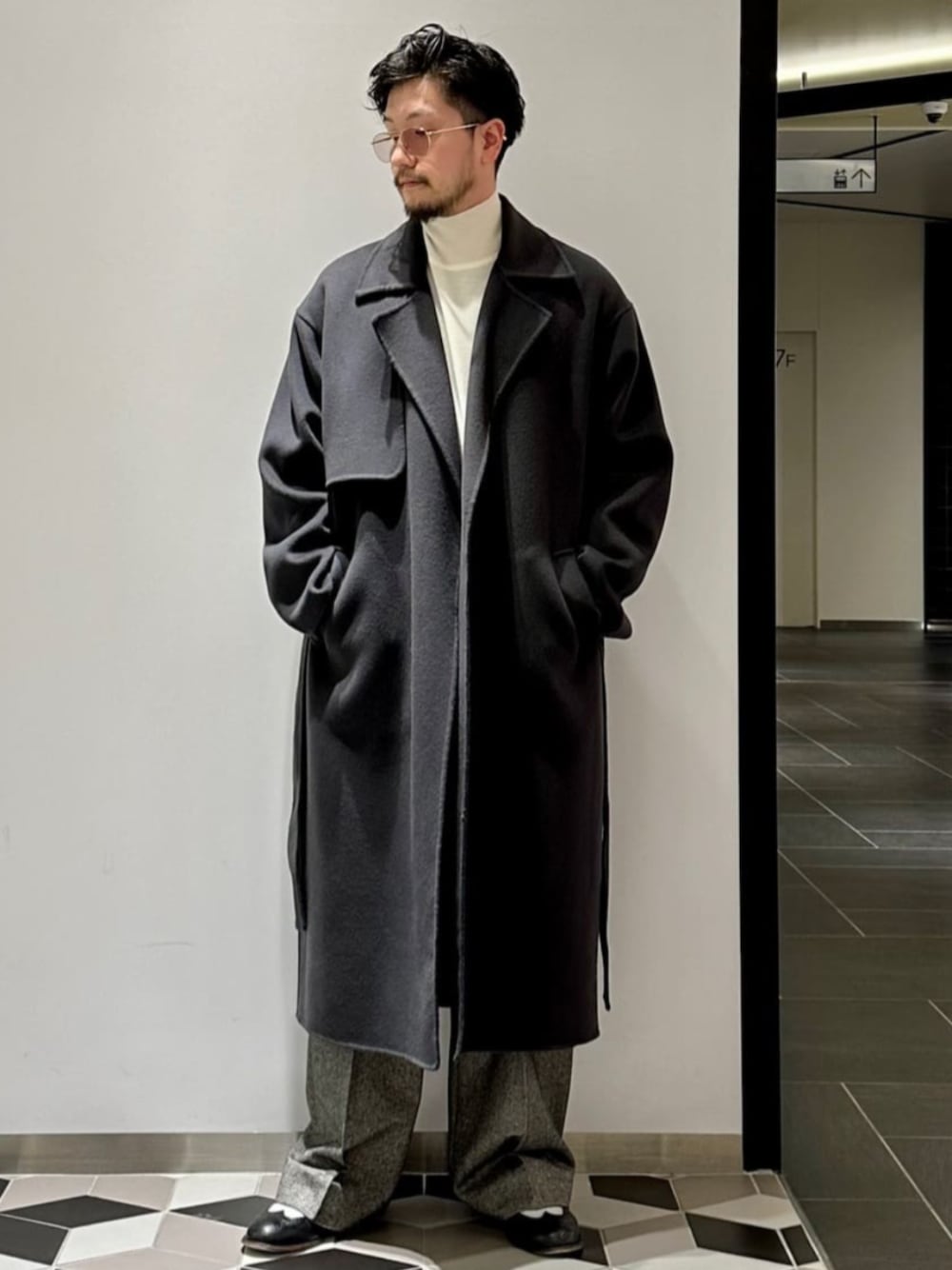 CALMER(カルメール) 別注 ハミルトンリバーコート 柔らかい雰囲気が魅力のロングコート。 首元が開くため、ハイネックのインナーを合わせています。 身長体重 : 170cm/62kg 普通体型 普段サイズ : M 着用サイズ : M 年齢 : 30代中盤 サイズ感 : 程よくゆとりあり。 素材感 : 非常になめらかなウール生地。 着心地 : 軽くて着やすい。
