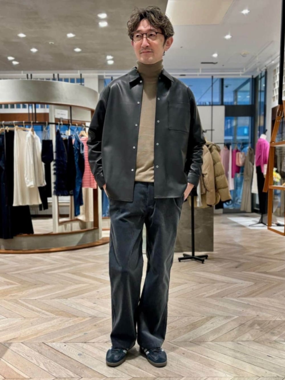 片胸ポケット付きのシャツ型デザイン。 高級感のあるリングドットが、シンプルなデザインの中にポイントとして効いています。 身長:183センチ/普段サイズ:XL/着用サイズ:M 体型:がっちり体型 サイズ感:Mサイズでジャストサイズ 素材感:しなやかでしっかりとしたレザー素材 着心地:軽くて柔らかいので着やすい