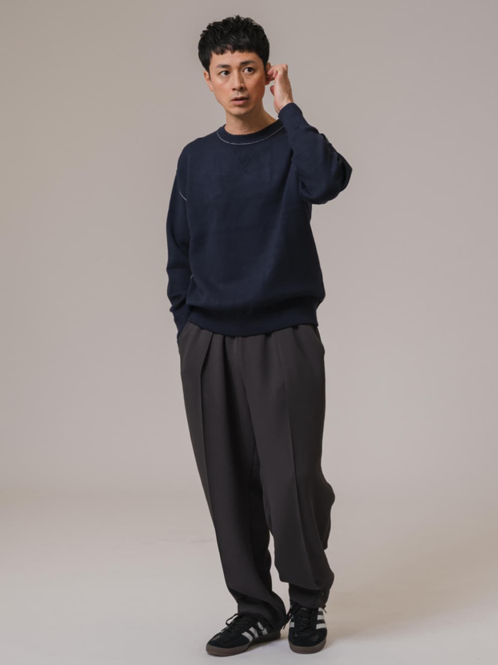 30代後半/身長:176センチ / 標準型 / 普段サイズ:L ホワイトのステッチが効いたネイビーのニット。 程よいデザインなので、スラックスなどきれいめなアイテムとも合わせやすく、大人の男性にもおすすめです。 ■スウェットライクニット 着用サイズ:L ---------------------------------------------------------- サイズ感:リラックスシルエットでゆったりしてます 素材感 :様々な色が入ったジャガード生地 着心地 :中肉で柔らかいです ----------------------------------------------------------