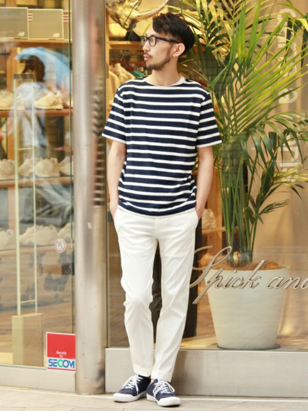 ボートネックのボーダーTシャツとホワイトパンツ+ネイビーシューズでEDIFICEらしいマリンテイストに仕上げました。 ボーダーTシャツはパイル地のような柔らかさがあり、リラックス感のあるスタイリングにお勧めです。