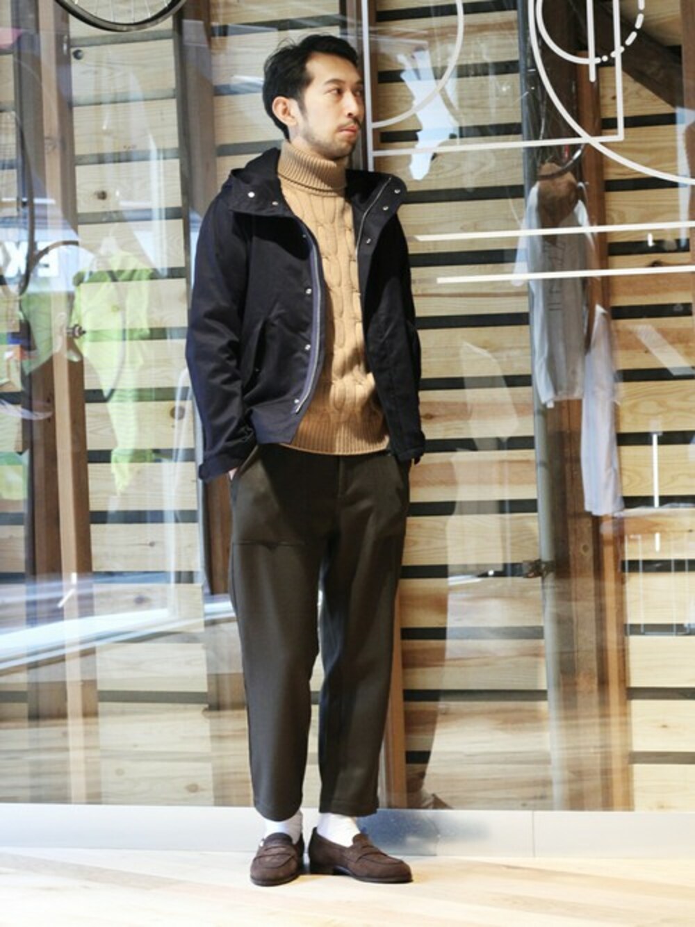 米軍のM-1951(通称モッズコート)をベースに着丈を短くし、フードも一体型にしています。高密度に織られた素材なので風を通しにくく、防寒性も備えているのも魅力の一つです。キャメルのニットとミリ利他リーな雰囲気のカーキのボトムを合わせトレンド感をMIXしたスタイルです。