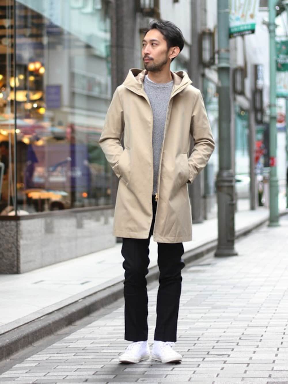 スポーティーな印象のフードコート。秋冬シーズンにおいても大変ご好評頂きましたフードコートを春シーズンの素材で提案。EDIFICEらしいネイビーでまとめたスタイルです。