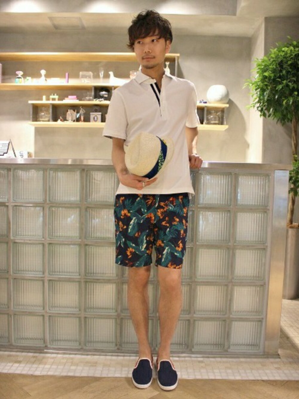 シンプルなドウェポロにアロハ柄のショーツをあわせたリゾートスタイル。