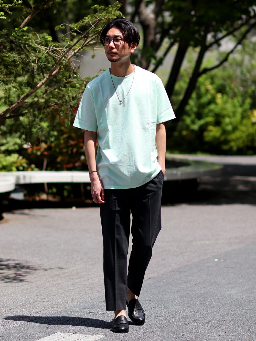 【コールドダイ クルーネック ショートスリーブ Tシャツ】 無地ながらムラ感のある染めが美しいTシャツ。 低温で染めることにより、あえて糸の芯まで染めないコールドダイを施したTシャツは陰影感が強調された躍動感が目を惹きます。リラックス感のあるシルエットを採用しているのでストレスのない着心地もポイントです。 身長:178センチ / 普段サイズ:M or L/ 着用サイズ:L サイズ感:細すぎず緩すぎずベーシックなシルエット 素材感:夏向けの生地 着心地:コットンで肌馴染みの良い着心地