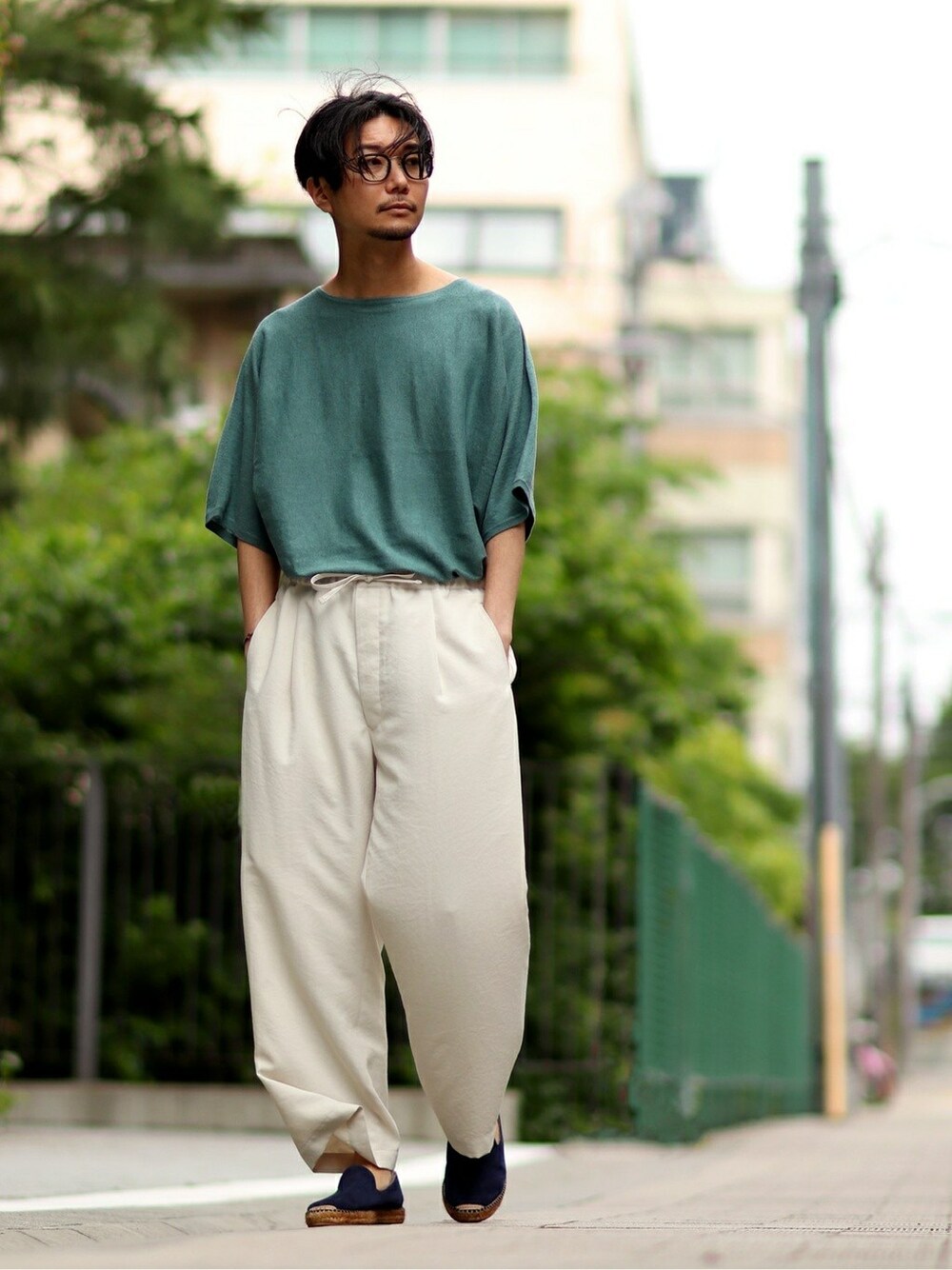 【walenode / ウェルノード 】 別注 フラクセン ニット カットソー】 たっぷりとった身頃とアームホールの設定をしていないドルマンスリーブのようなゆったりとしたシルエットが今の気分を現した一着です。 パンツもリラックス感のあるものを選定し、足元はエスパドリーユを取り入れリラックス感と軽快さを演出したスタイリング。 身長:178センチ / 普段サイズ:M or L/ 着用サイズ:L サイズ感:リラックス感のあるルーズなシルエット 素材感:細やかながら編地がしっかりとした生地感 着心地:柔らかく肌に馴染む
