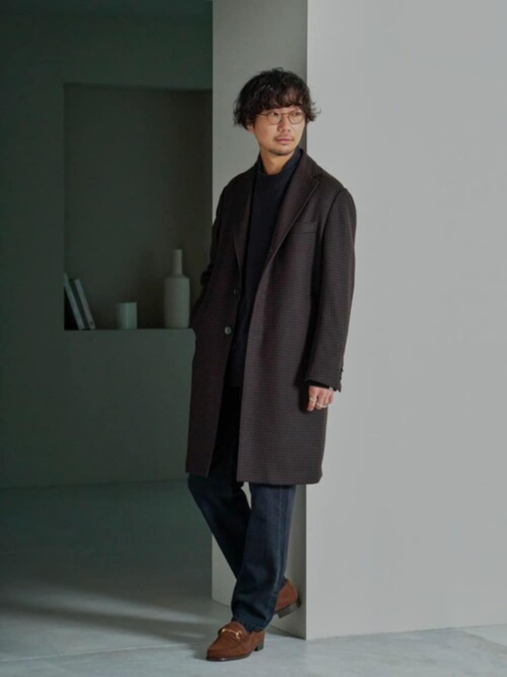 miuraのチェスターコート「SUPER 140's ウール / カシミヤ チェスターコート」を使ったコーディネート
