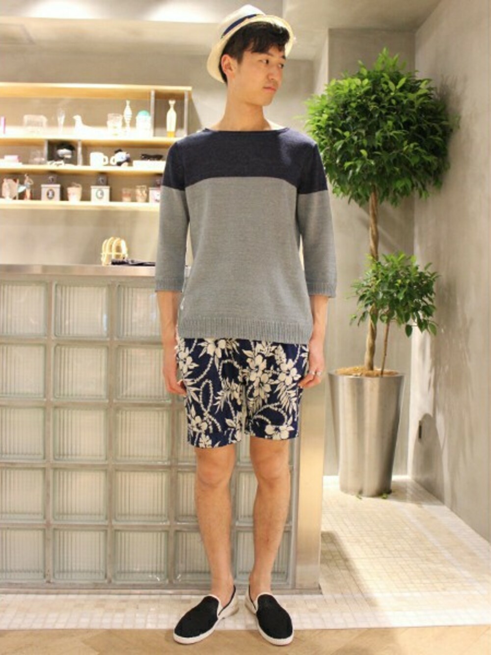 バイカラーと柄ショーツで今季らしいトレンド感のあるスタイリング。