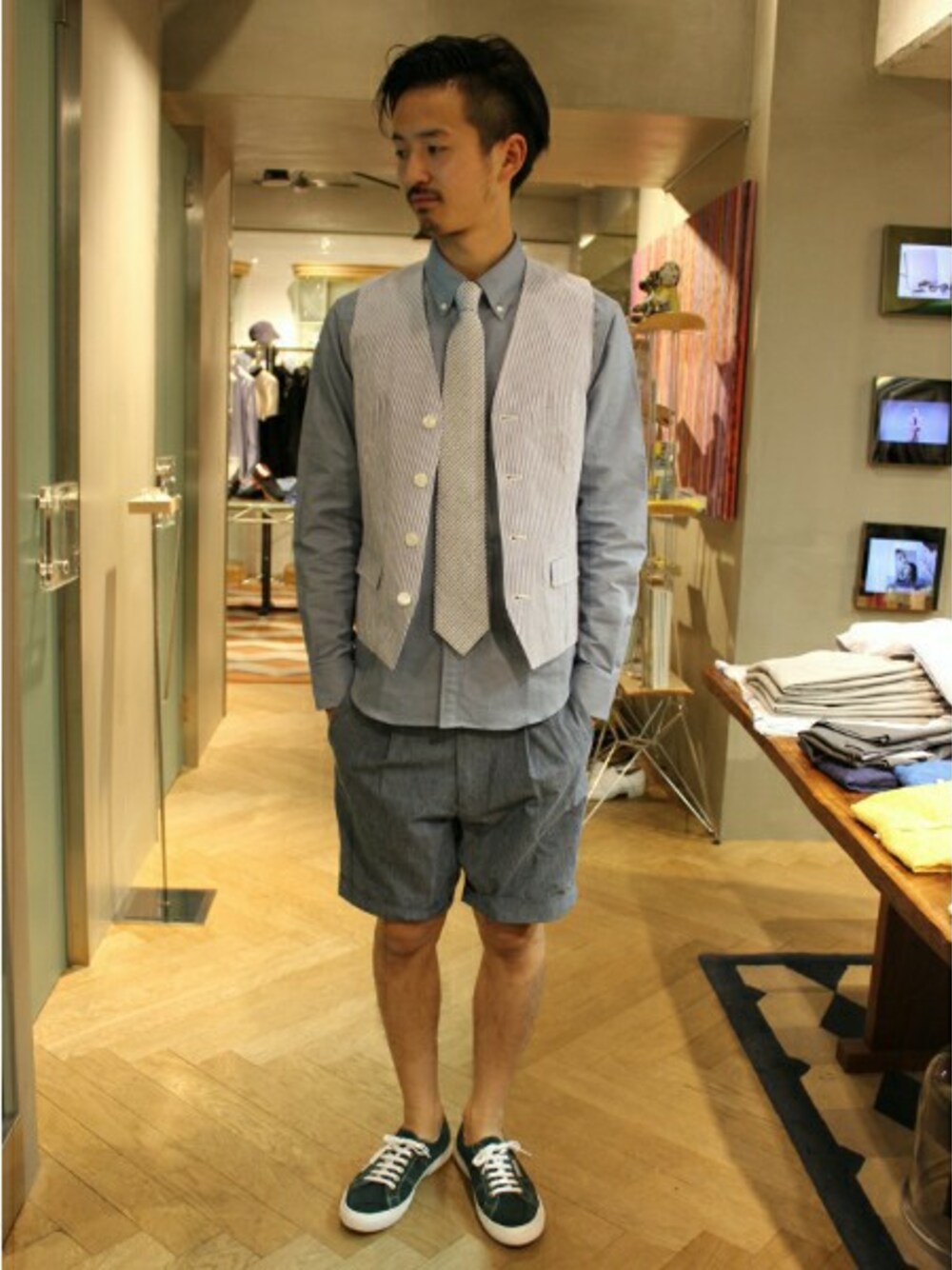EDIFICE TOKYO店スタッフ3のベスト「【GAINER6月号掲載】シアサッカー ジレ」を使ったコーディネート