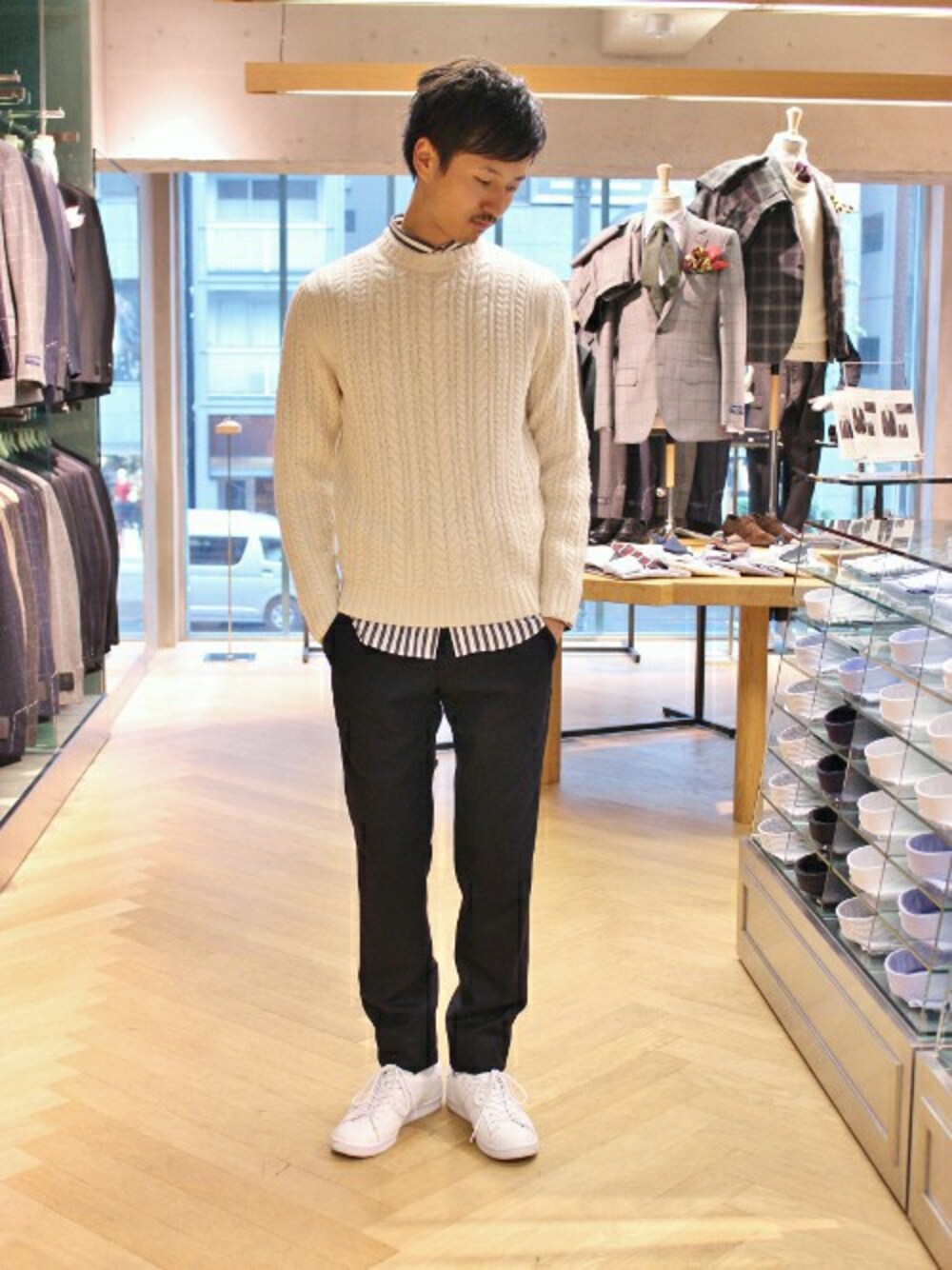 EDIFICE TOKYO店スタッフ3のニット/セーター「◇CASHMERE ケーブルクルーネック プルオーバーニット」を使ったコーディネート
