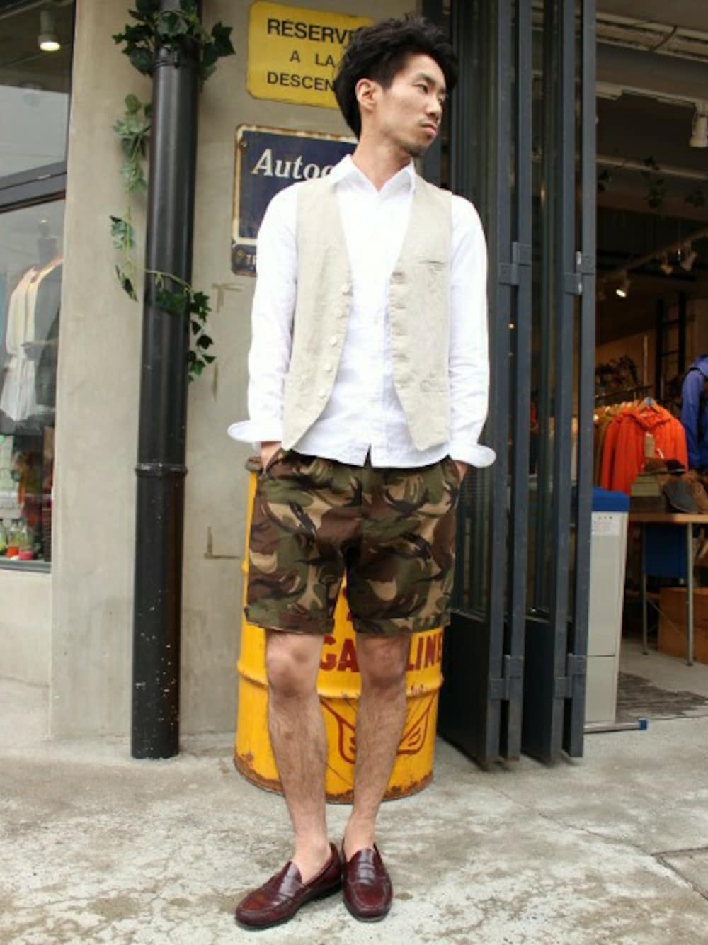 シルエットのきれいなカモ柄のショーツは、シャツ+ジレなどの上品な合わせ方でも違和感なく着用いただけます。