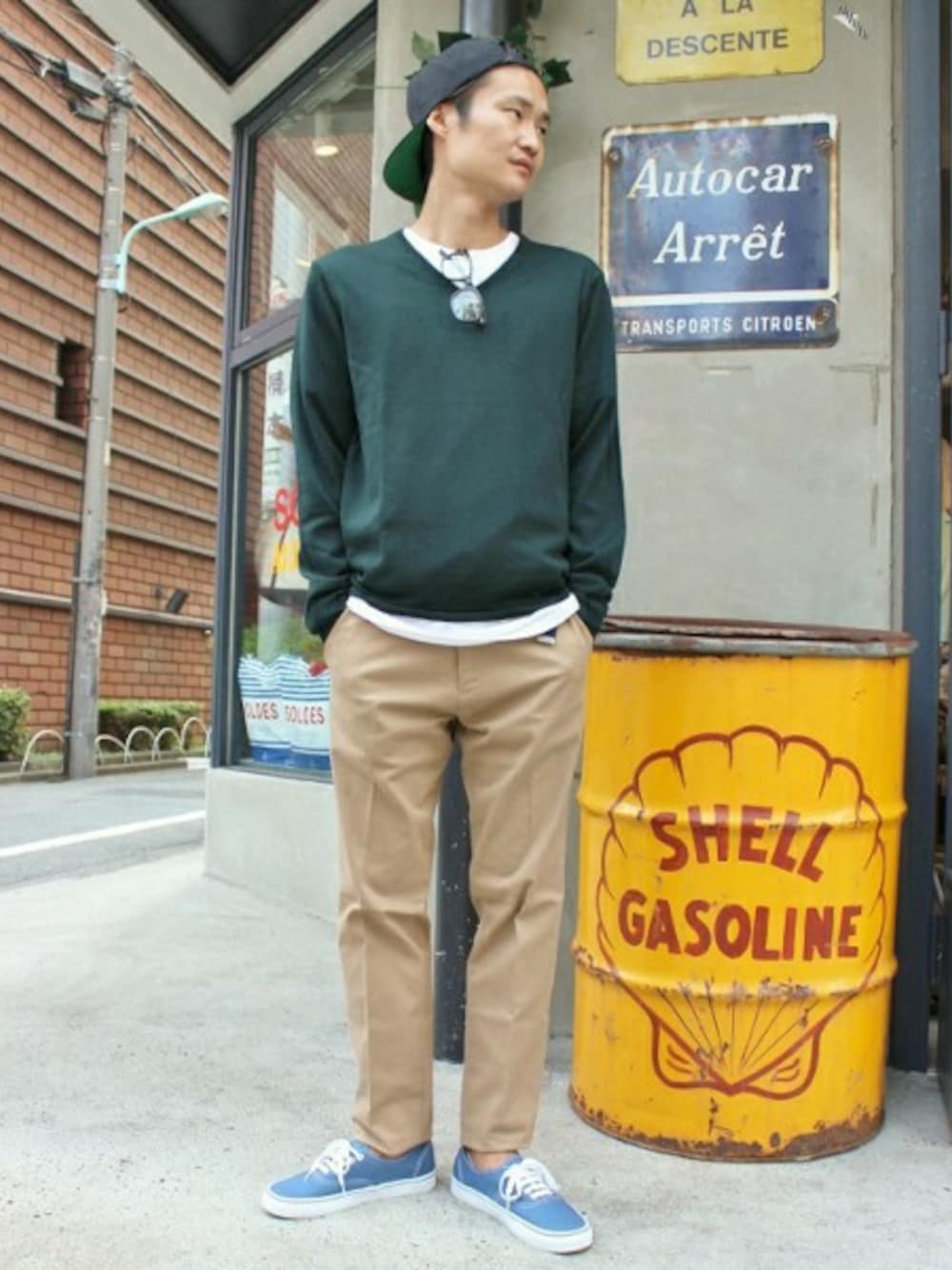 417byEDIFICE渋谷店スタッフ2のニット/セーター「◇【FINE BOYS9月号掲載】14GウオッシャッブルニットVネックプルオーバー 」を使ったコーディネート