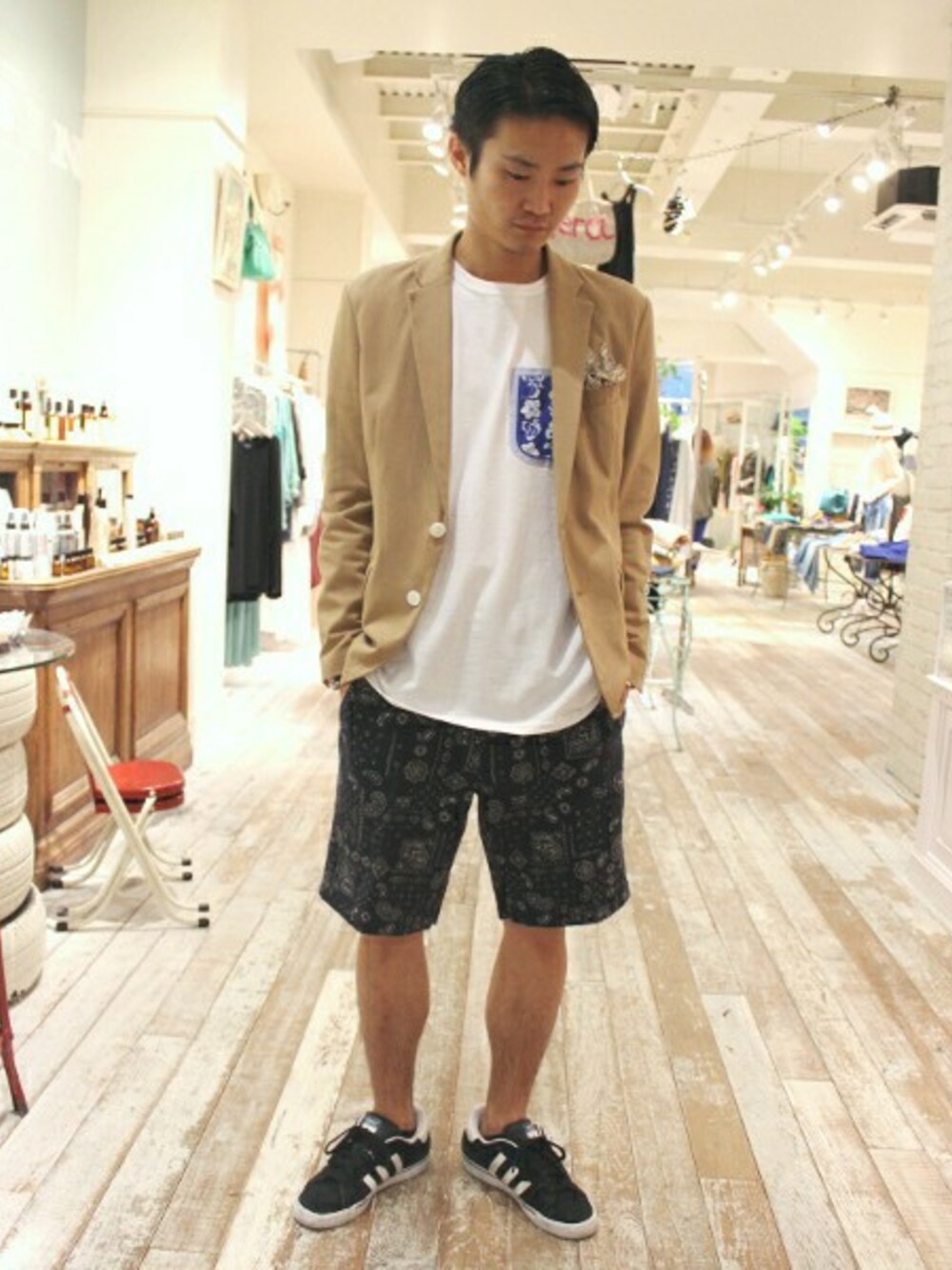 上品なキャメルのジャケットにTシャツ+ショーツを合わせることでラフなコーディネートに。