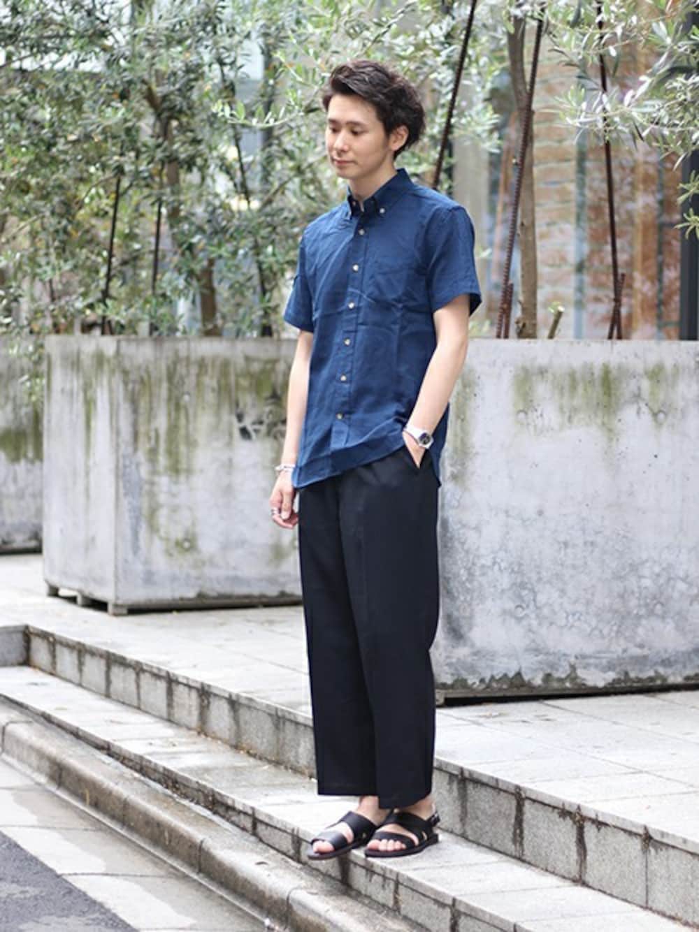 涼しげなパナマ織りのシャツをメインにコーディネート。カジュアルな素材感を敢えてダークトーンでコーディネートし、上品な印象に纏め上げました。トレンドのワイドパンツを合わせ、Aラインを意識したシルエットがポイントです。