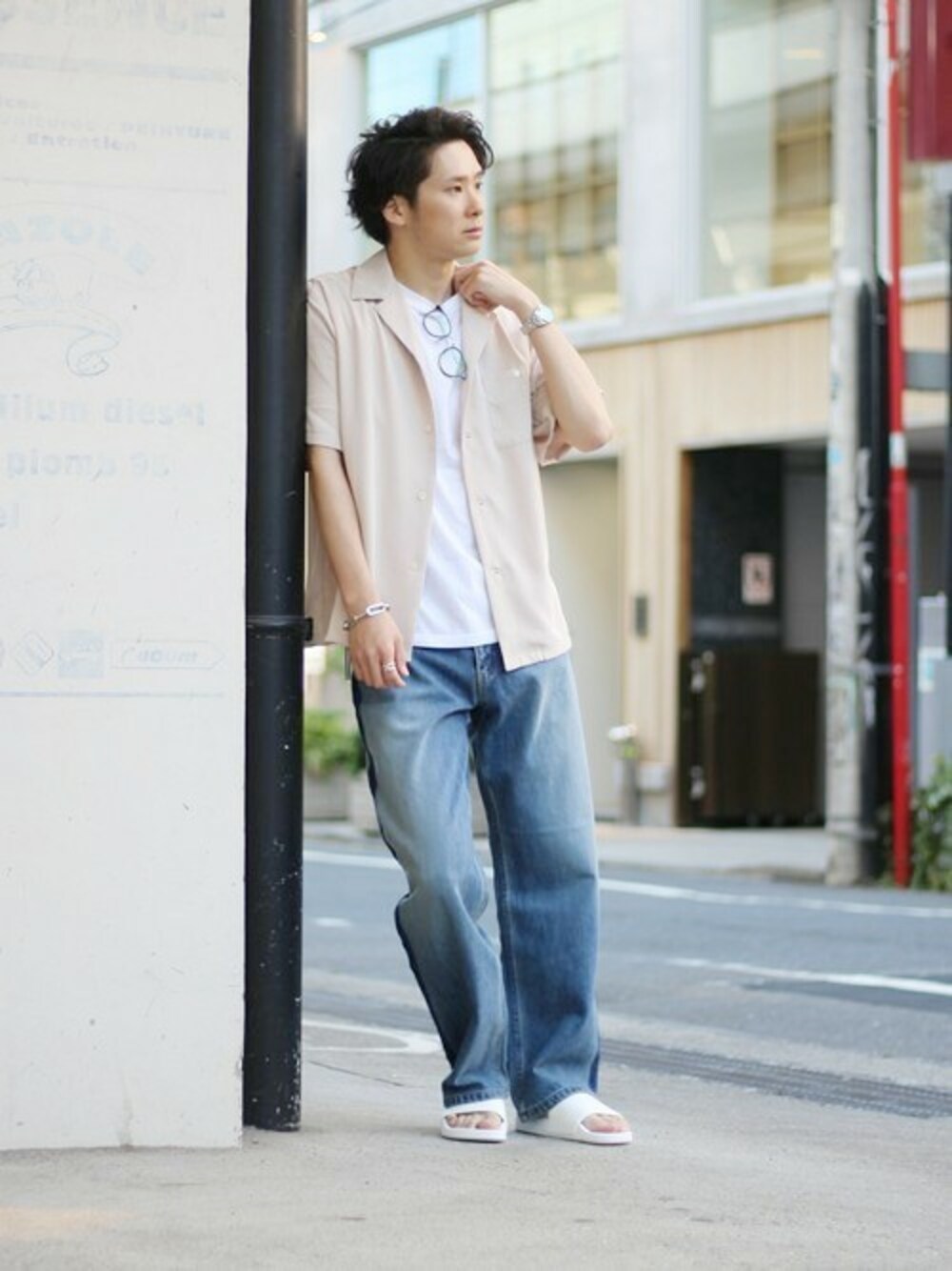 トレンドアイテムの本命「オープンカラーシャツ」を、リラックス感のあるワイドデニムでコーディネート。全体的に明るめのカラーリングでまとめたサマースタイルです。