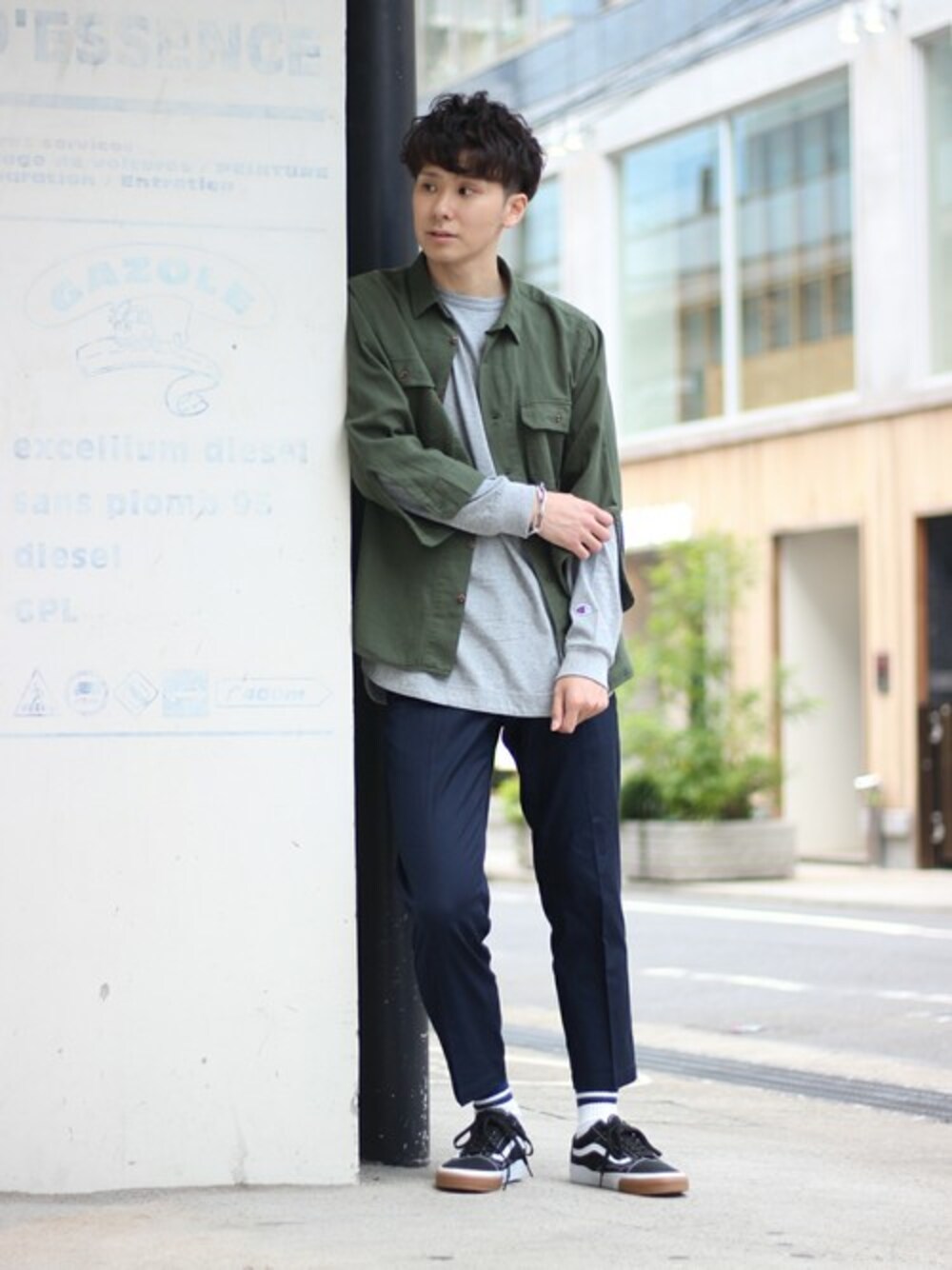 417別注のCHAMPIONのロンTを使ったレイヤードスタイル。キレイなテーパードシルエットのパンツを合わせて上品さをキープ。