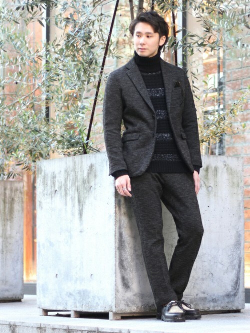 C/Wダブルフェイス2ボタンセットアップ。ジャージー素材の伸びのあるジャケット。タイトシルエットなのでスッキリとした印象に。シックなタートルをインナーに差し大人カジュアルに。