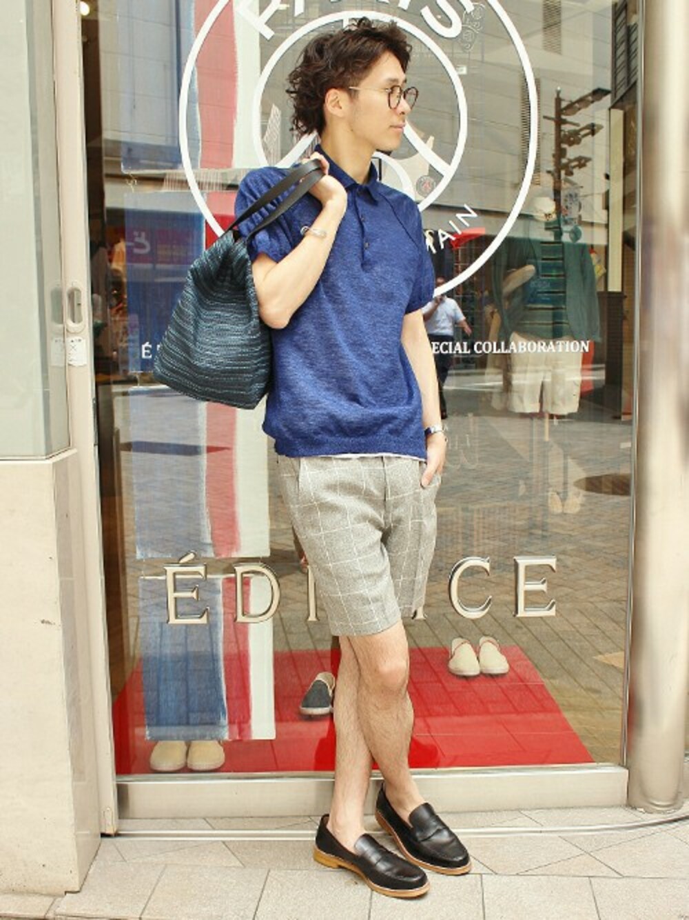半袖のリネンニットにウィンドウペンのショーツを合わせた上品なスタイリング。半袖ニットは夏の新しい定番アイテムとしてお勧めです。