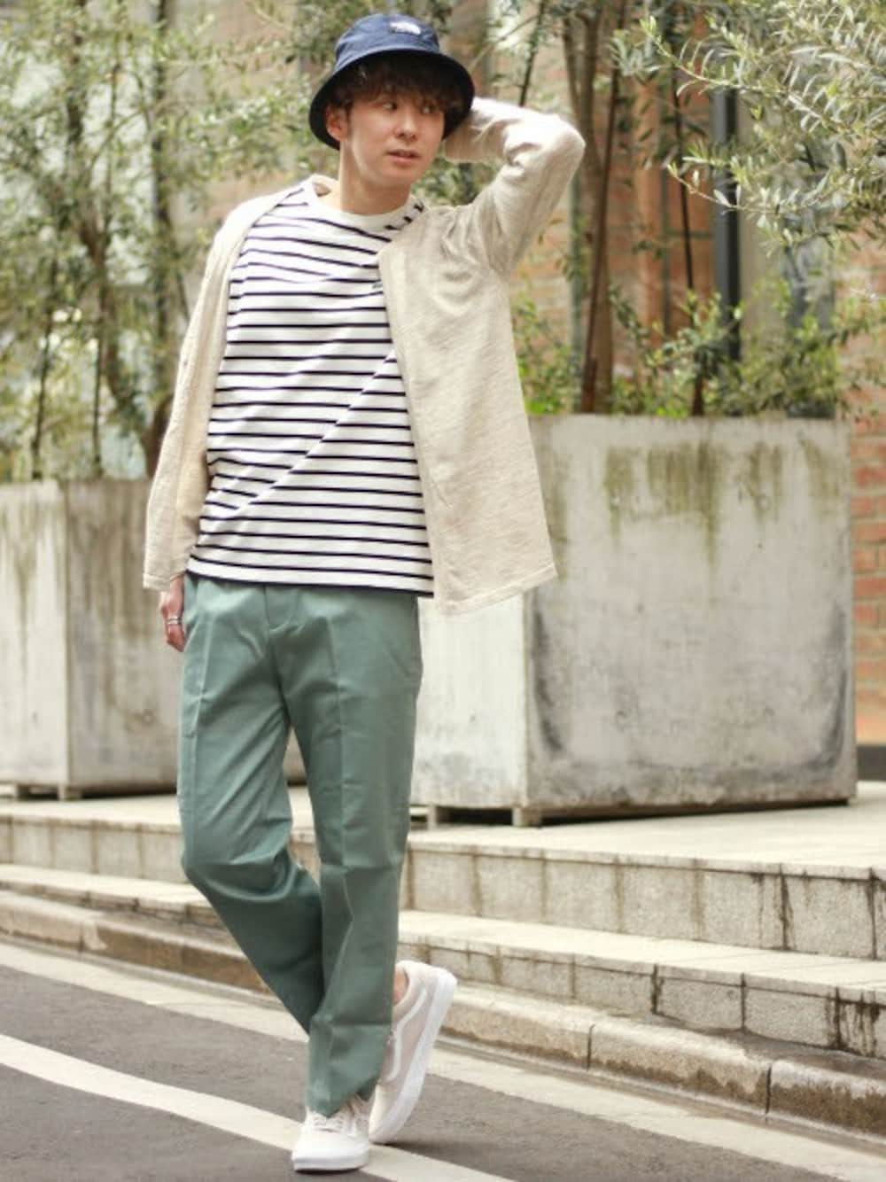 ラミーストレッチプレーティングカーディガン。ラミーを使用した軽やかな素材のプレーティングカーディガン。 ライトカラーのトーン合わせのスタイリングに。 ボトムスとハットで、アクセントカラーを持ってきました。