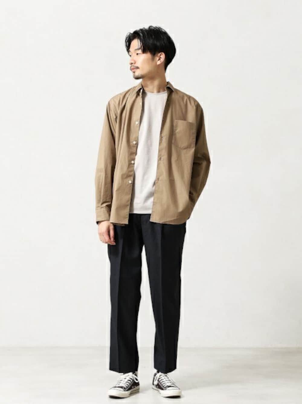 シャツにスラックスとキレイめコーデですが、足ともをスニーカーにすれば力の抜けた大人なカジュアルスタイルに。シンプルにまとめるのがポイントです。
