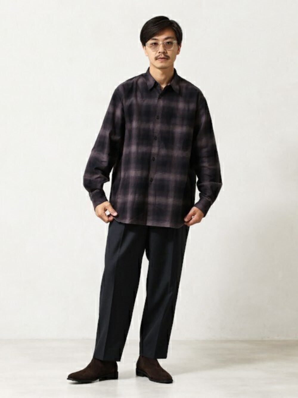 リラックスしたスラックスは履くだけで、今っぽい雰囲気になります。オンブレ―チェックで硬い印象にならないように外しを入れています。シューズは季節感を出すのに丁度いいスエード素材のブーツで秋コーデの完成です。