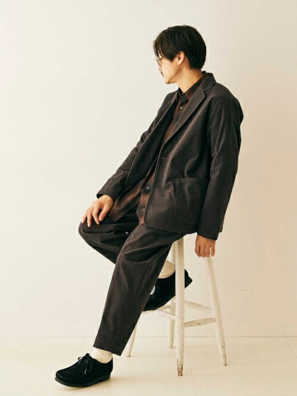 リラックスしたコーデュロイのセットアップは、一見カジュアルに見えがちですが、色のトーンを合わせることで大人っぽい雰囲気に様変わり。足元はトレンドのクラークスで引き締めれば砕け過ぎない大人カジュアルになります。