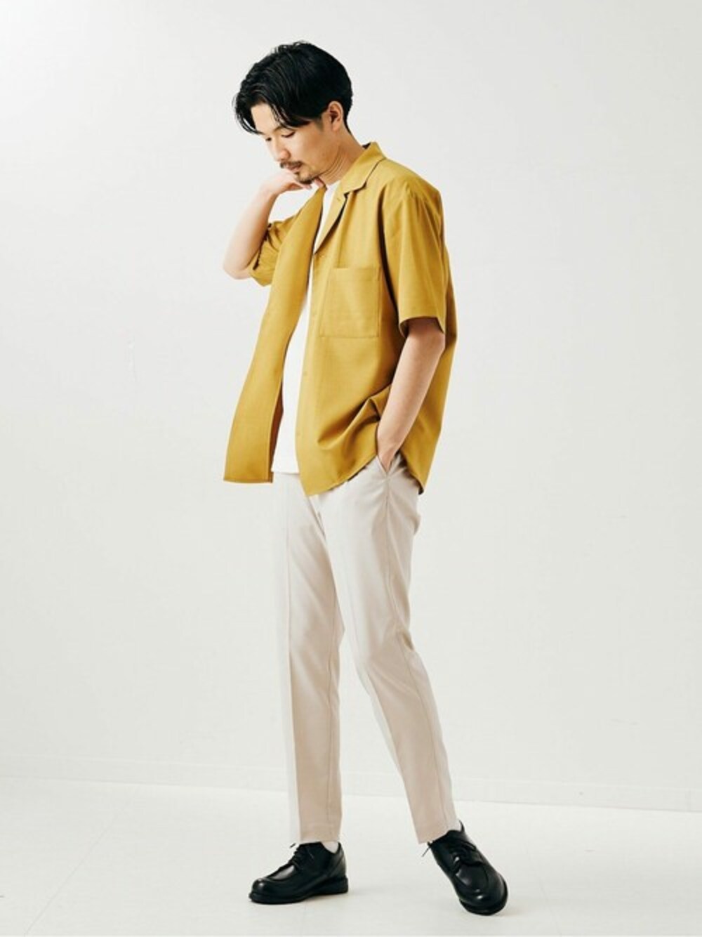 【Reflax / リフラクス】オープンカラーシャツ イエローをポイントにしたコーディネート。他の色使いを極力抑えてまとまりが出る様にしています。 身長:178cm/体重:60kg/体型:細身/普段サイズ:L/着用サイズ:L サイズ感:大きすぎないややリラックスしたサイズ感 素材感:ストレスの無い軽やかな素材感 着心地: サラリとした軽やかな着心地